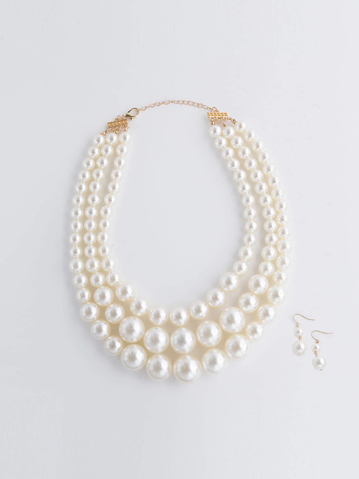 Collar de perlas con capas que van de mas pequeño al mas grande con aros.