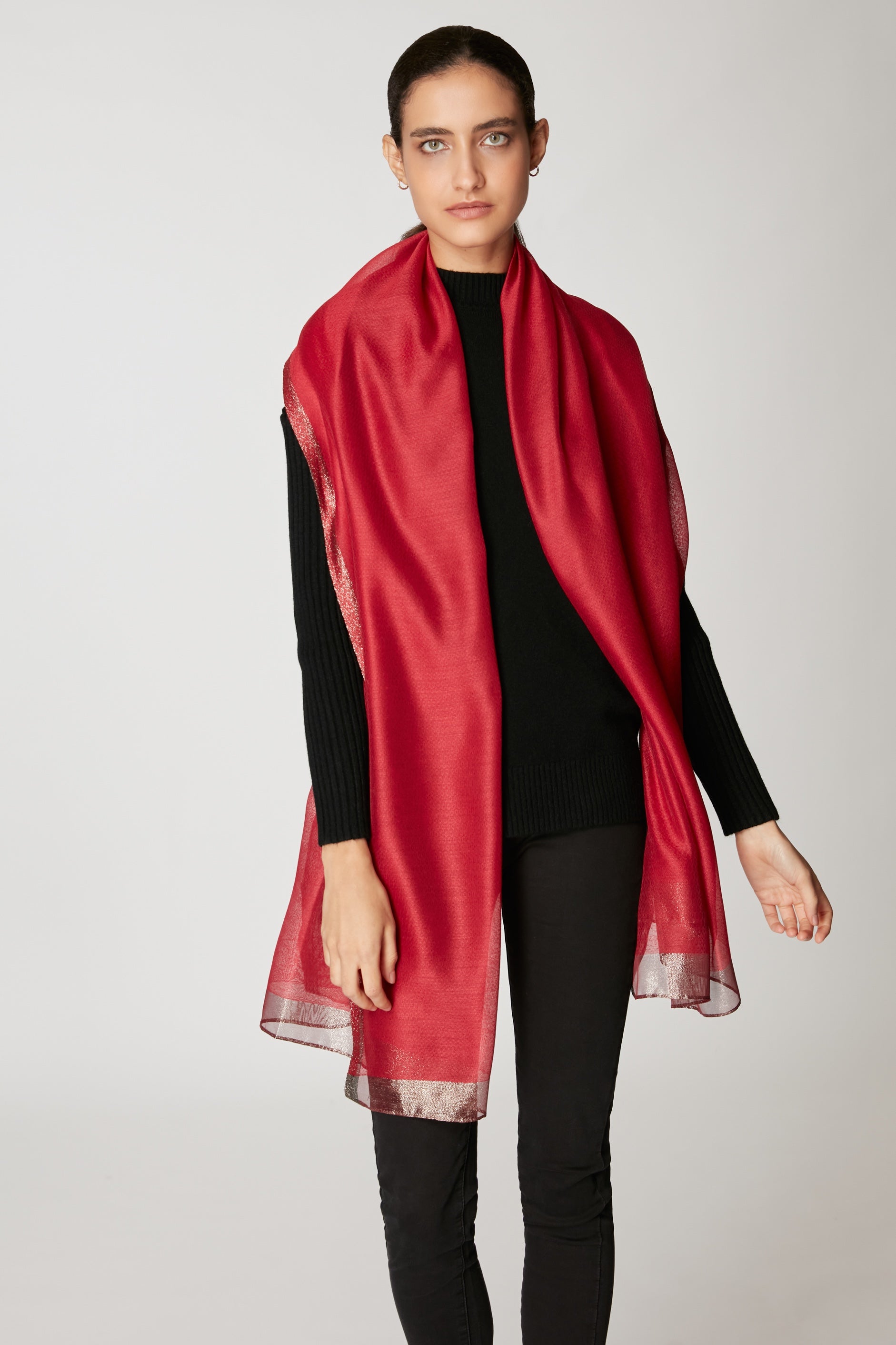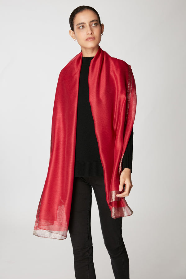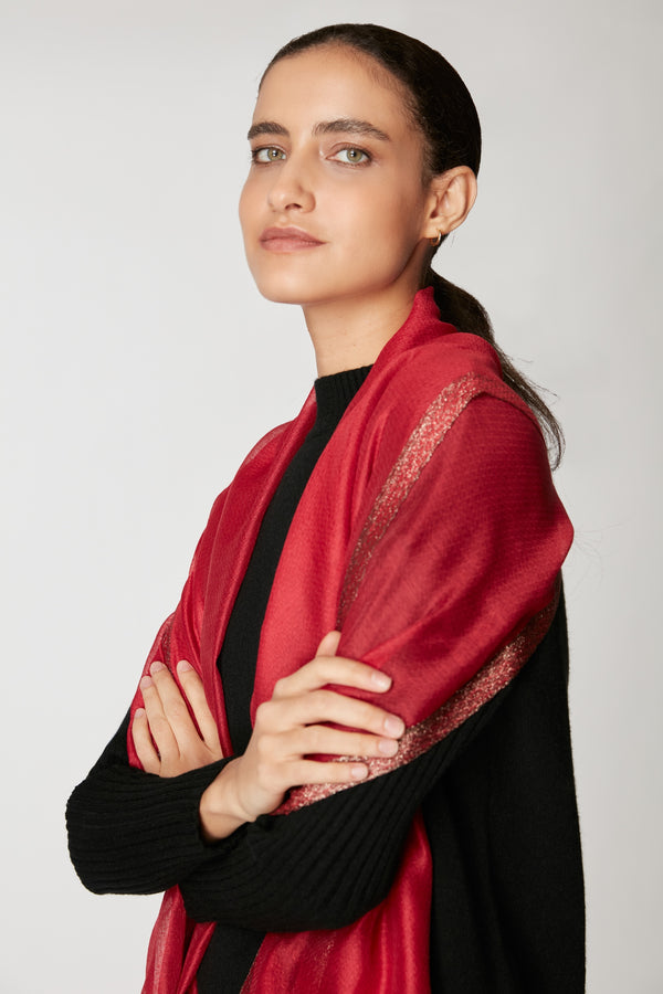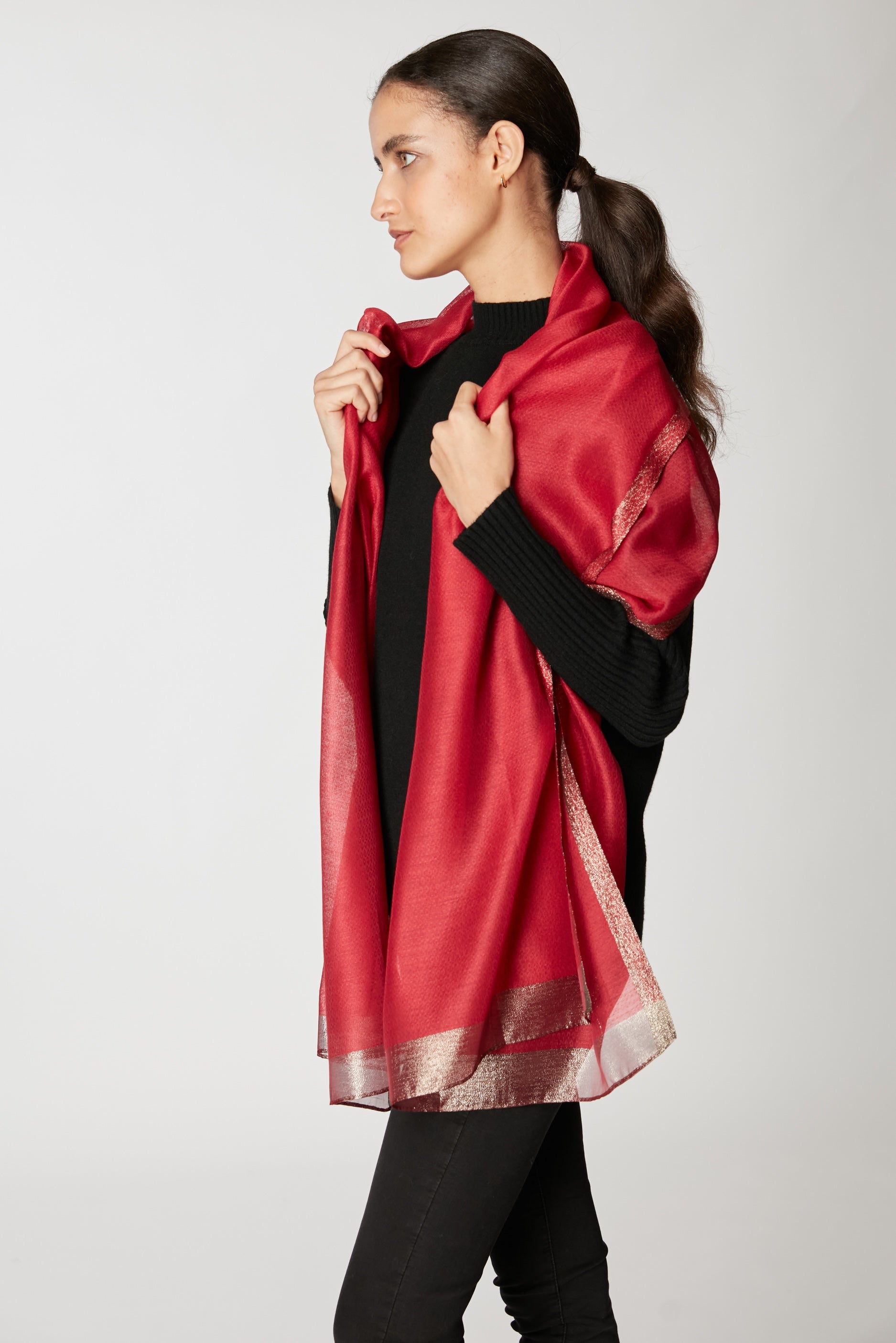 Echarpe rojo con detalles dorados, brinda un toque de color y sofisticación a tu vestimenta.