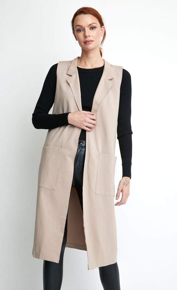 Gilette chaleco largo con cuello estilo mao y bolsillos a los lados. Ideal como prenda para usar en capas.