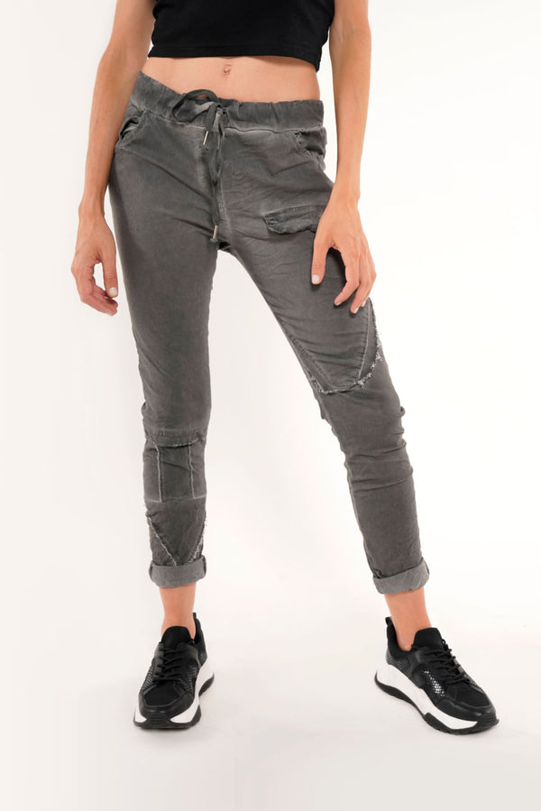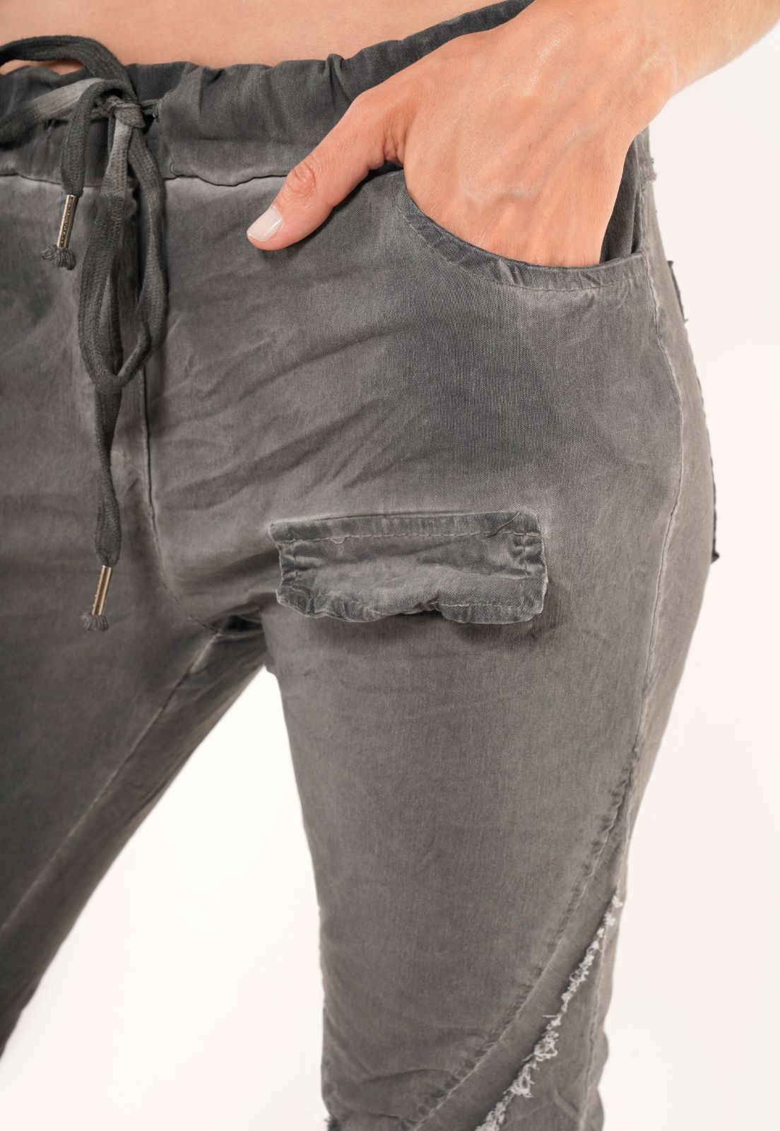 Pantalón relaxed fit, con detalles desgastados en cada pierna bolsillos. Cinta para ajustar en la cadera. Ideal para looks casuales