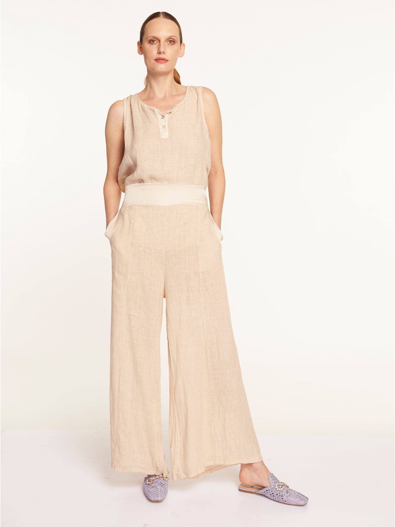 Pantalon palazzo con bolsillos en sus costados y una pretina de satin elasticada en parte posterior, brinda una comodidad para uso diario