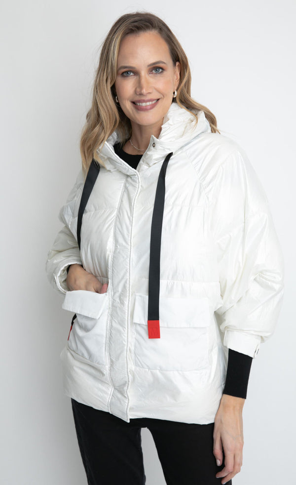 Parka estilo metalizada, con cinta para ajustar capucha, con cierre. Ideal para looks casuales