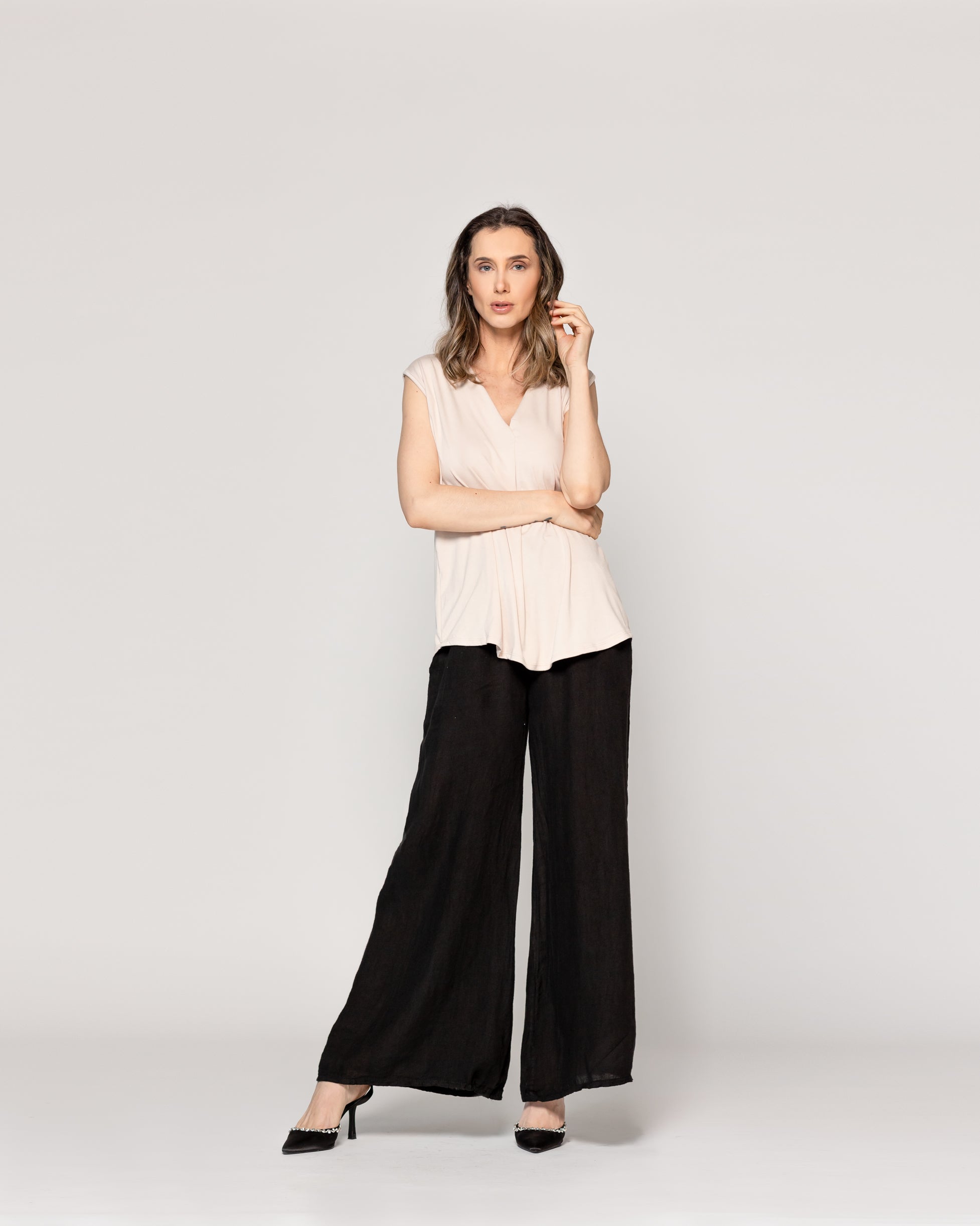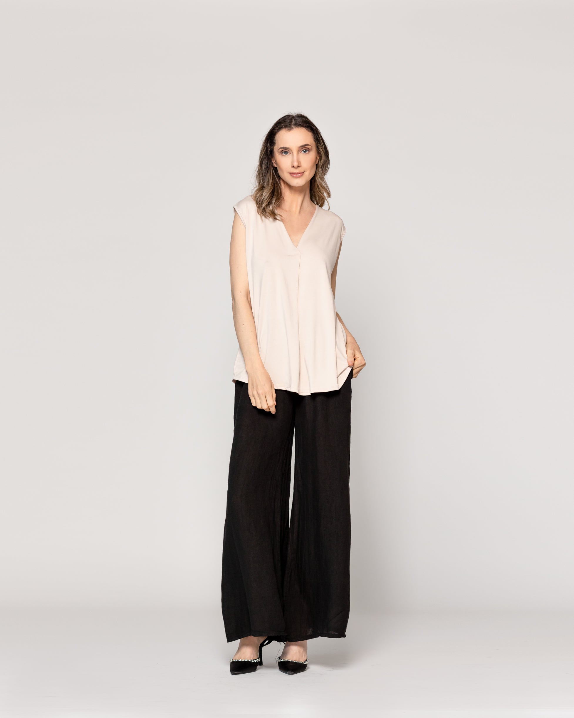 La polera Olga Lineatre Escote V es una prenda sin mangas de caída amplia y estructura liviana, perfecta para quienes buscan frescura y libertad de movimiento en sus looks diarios. Su escote en V con pliegue central aporta una sutil elegancia y estiliza el torso, convirtiéndola en una opción versátil que puede llevarse tanto sola como en capas. El diseño fluido y sin ajustes al cuerpo la hace ideal para climas cálidos o para combinar con prendas más estructuradas como blazers o chaquetas. Una base infalible para armar conjuntos con estilo y comodidad en cualquier ocasión. Disponible en colores básicos.