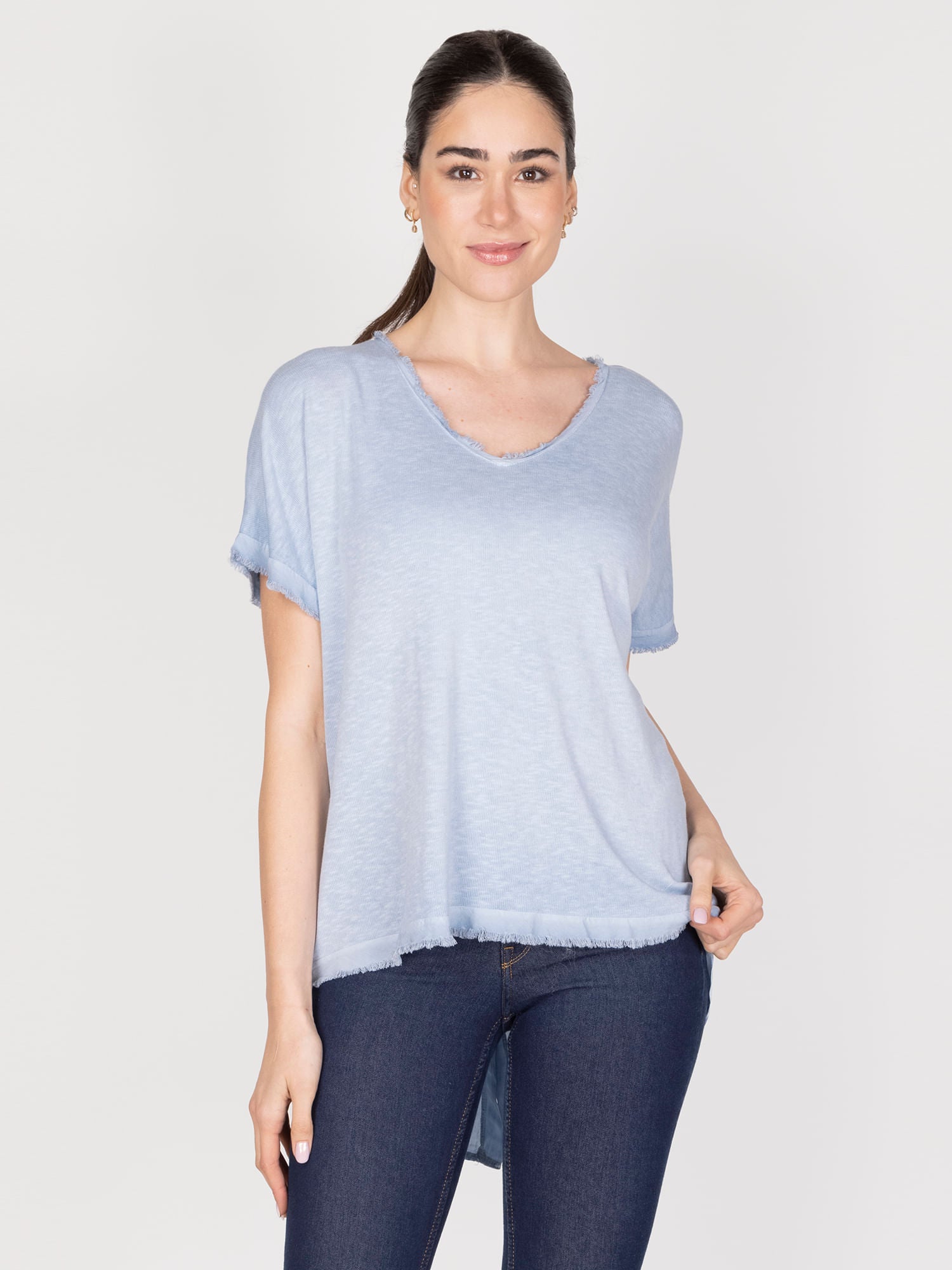 Polera manga corta, cuello en V, con detalle en cuello y mangas destilo deshilachados y corte asimétrico. Ideal para looks casuales.