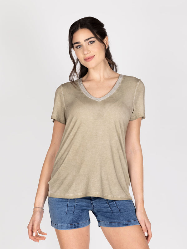 Polera manga corta cuello en V con detalle de piedras en cuello. Ideal para looks casuales