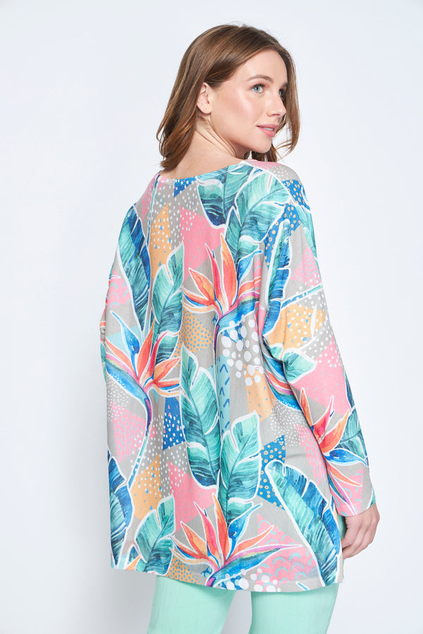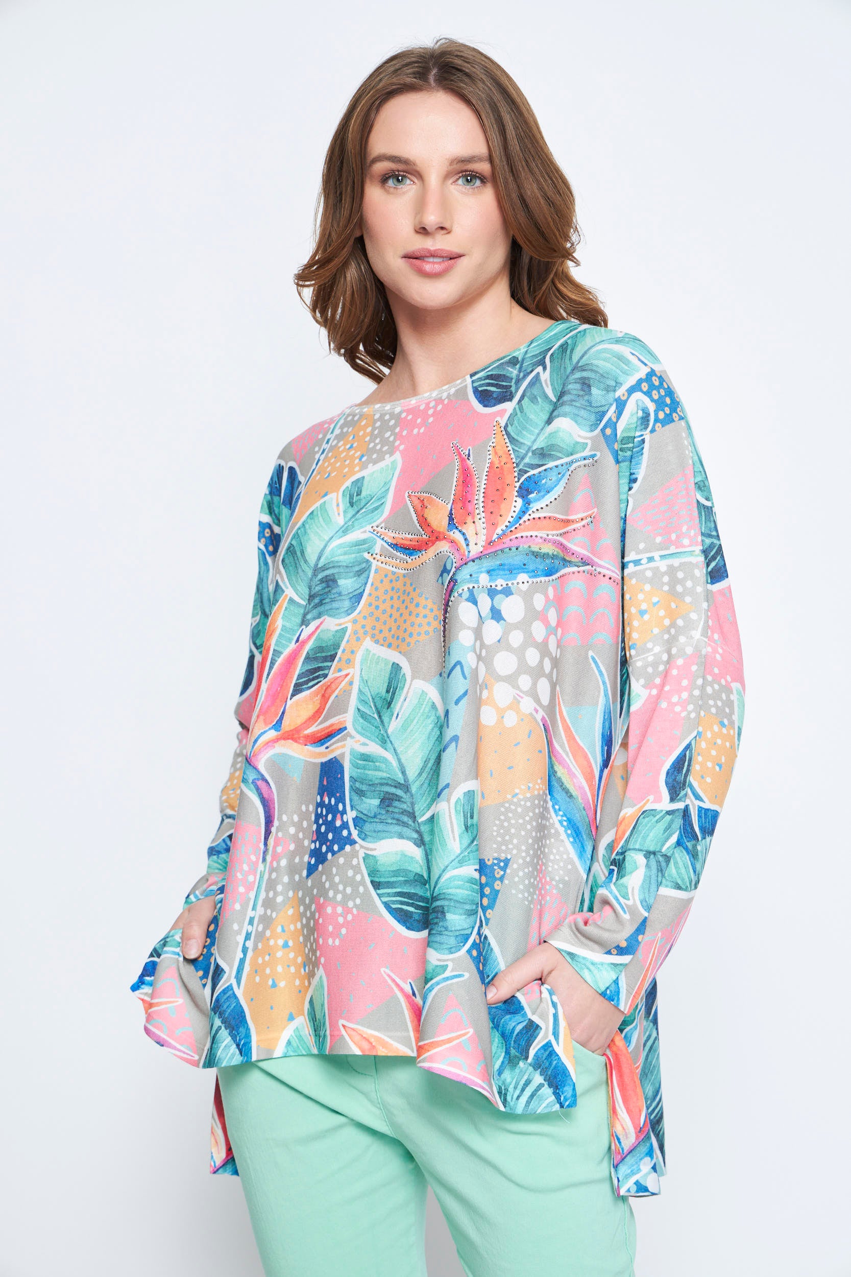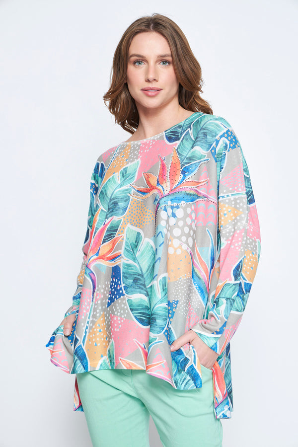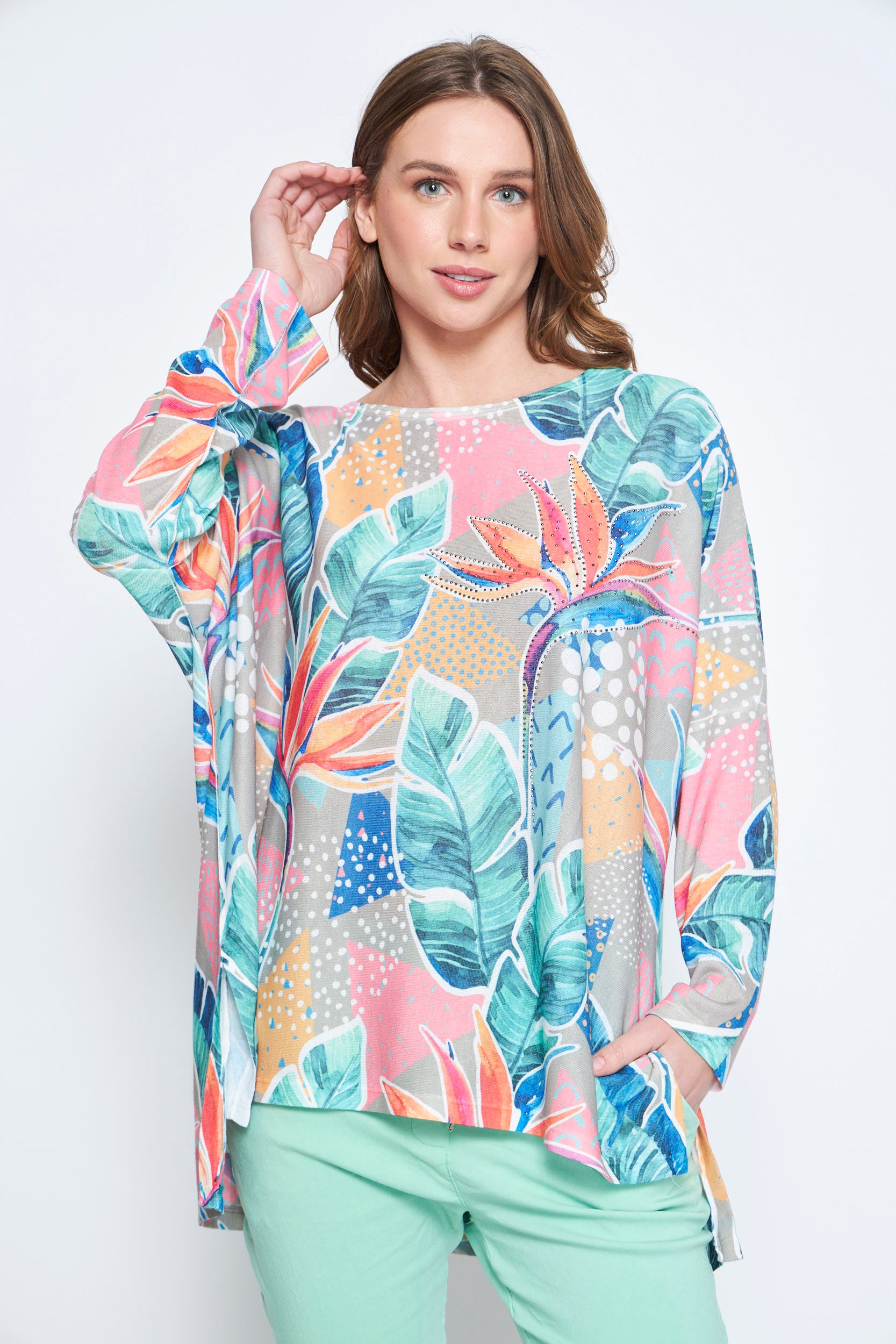 - Descripción: Polera con un vibrante estampado colorido de hojas, adornada con detalles de brillos que aportan un toque de elegancia. Diseñada con manga larga y cuello redondo, es perfecta para cualquier ocasión.