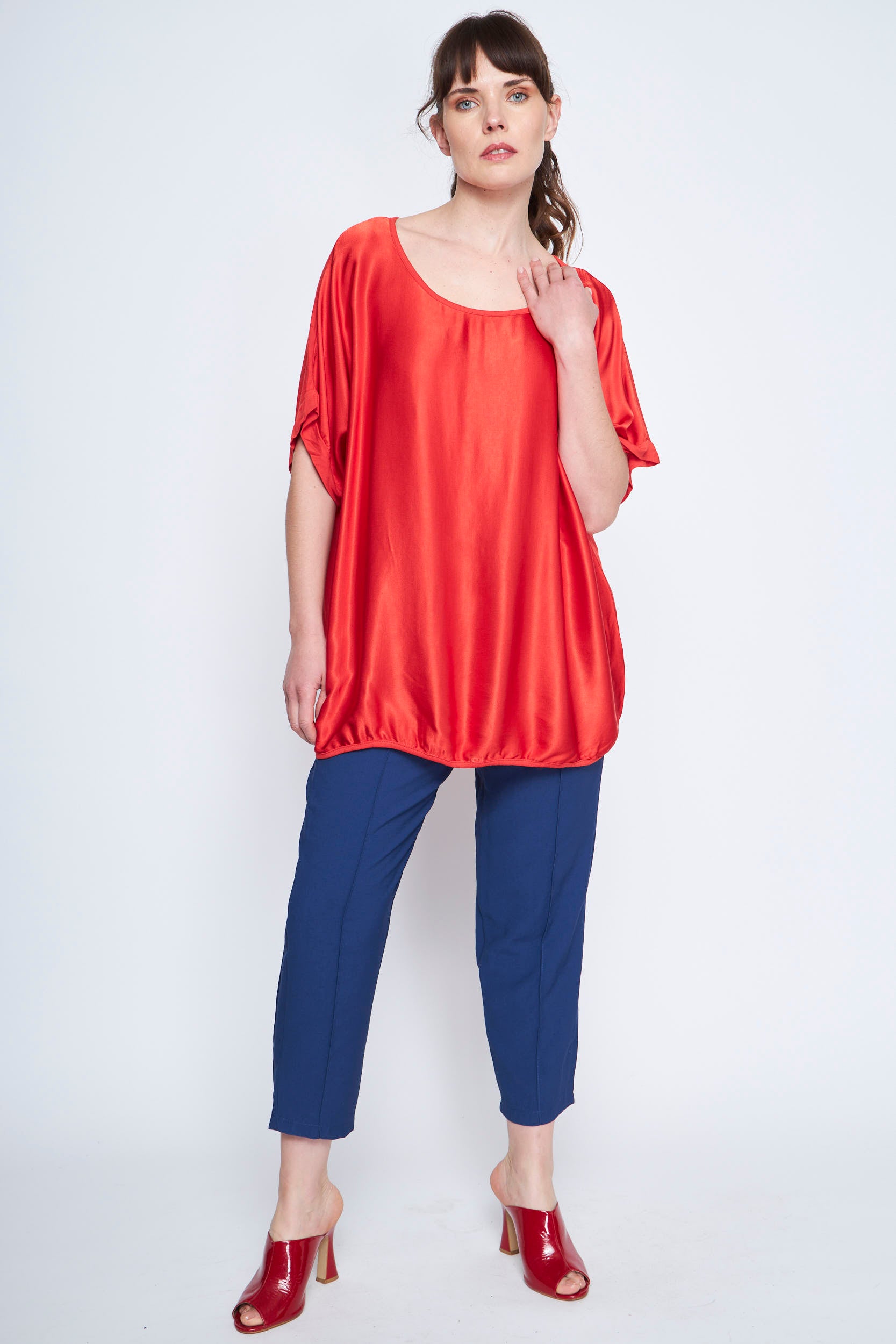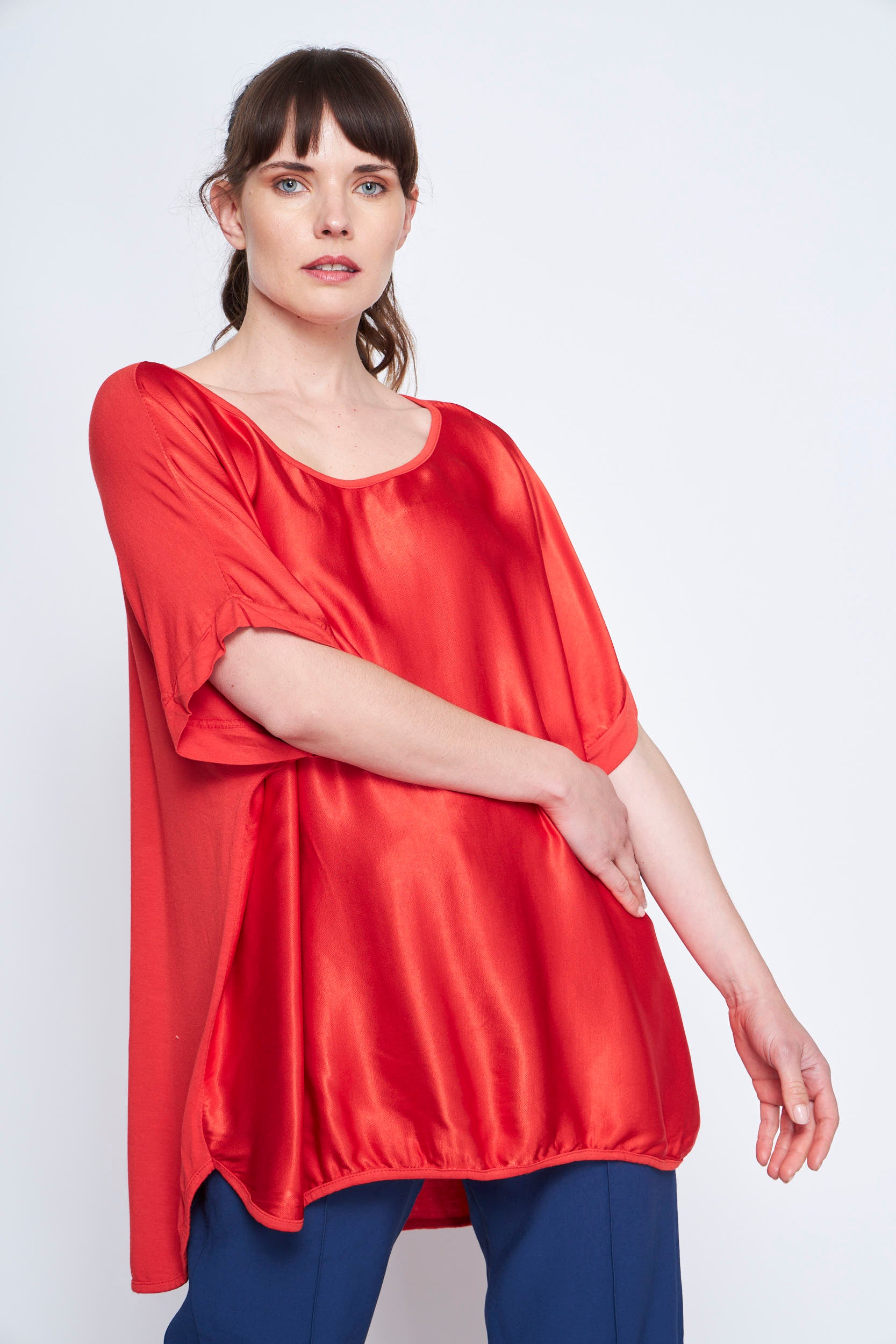 - Descripción: Polera holgada con escote redondo y manga corta. La parte delantera satinada le da un toque elegante y sofisticado, perfecta para cualquier ocasión.
