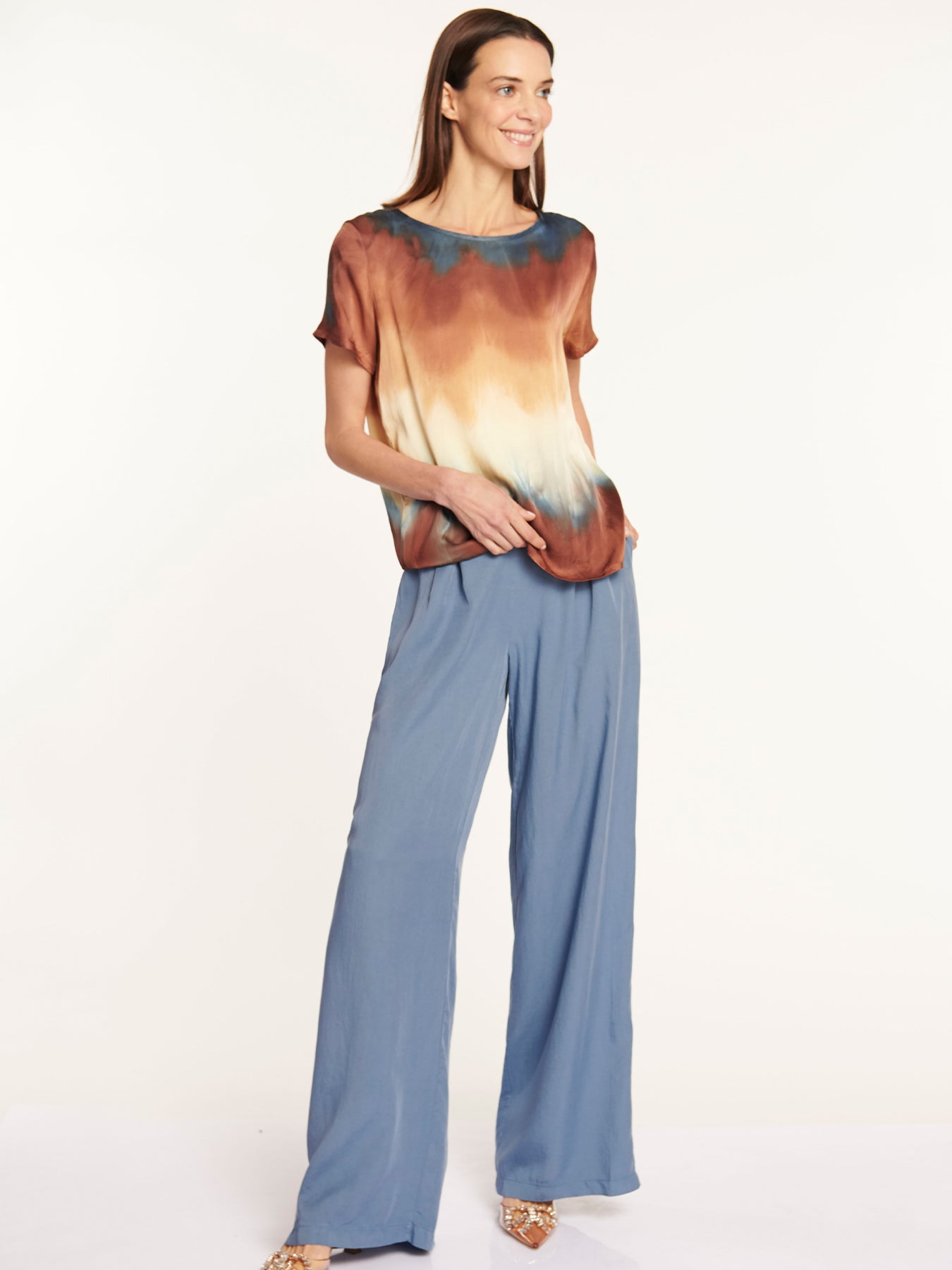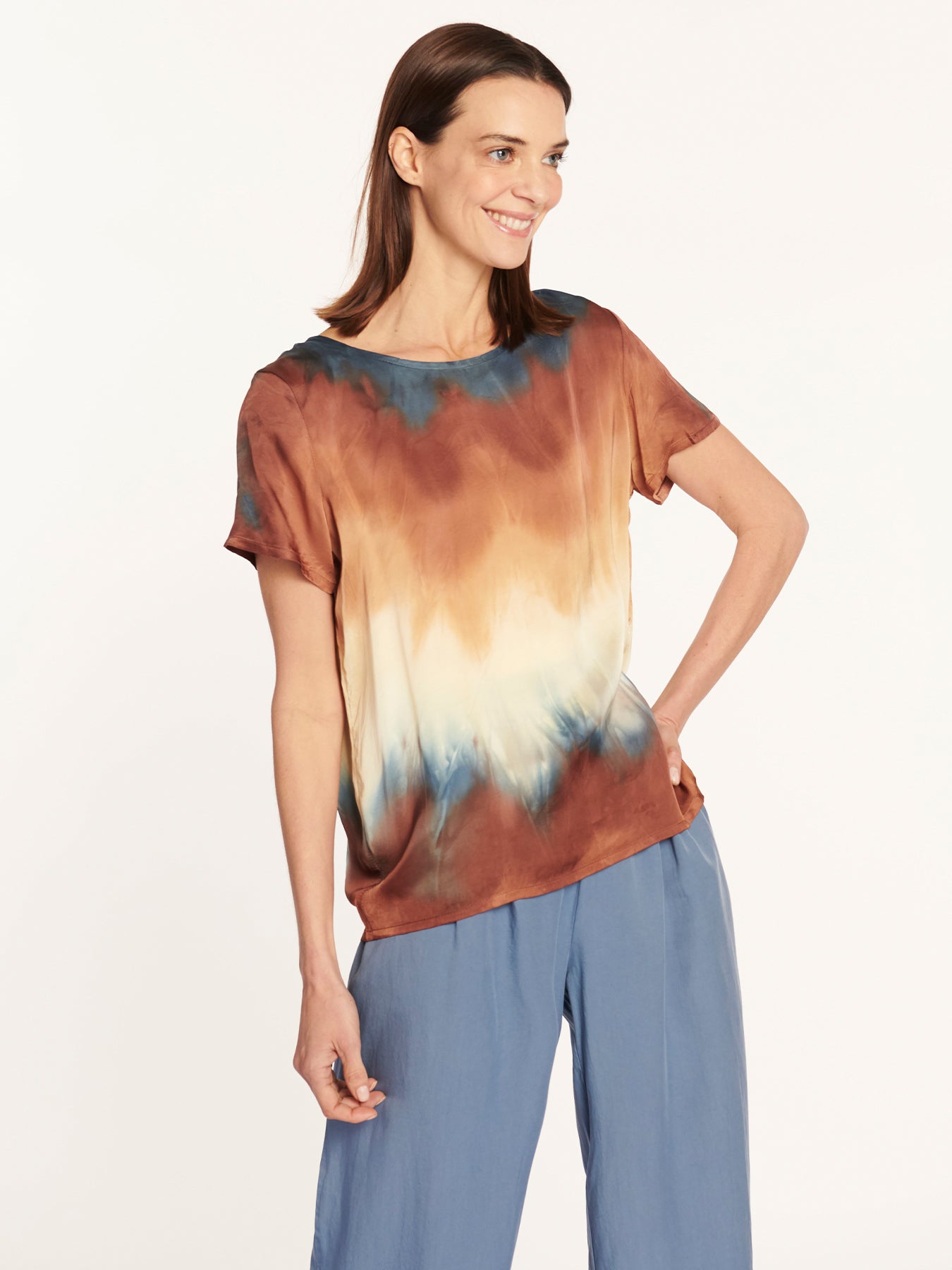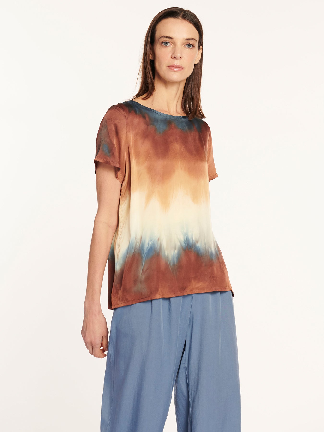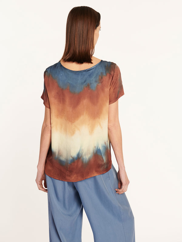 Polera manga corta tejido liviano con efecto sublimado colorido