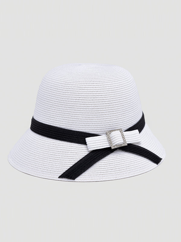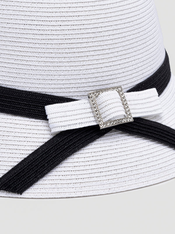 Sombrero blanco y negro con detalle de cinta. Ideal para looks casuales.