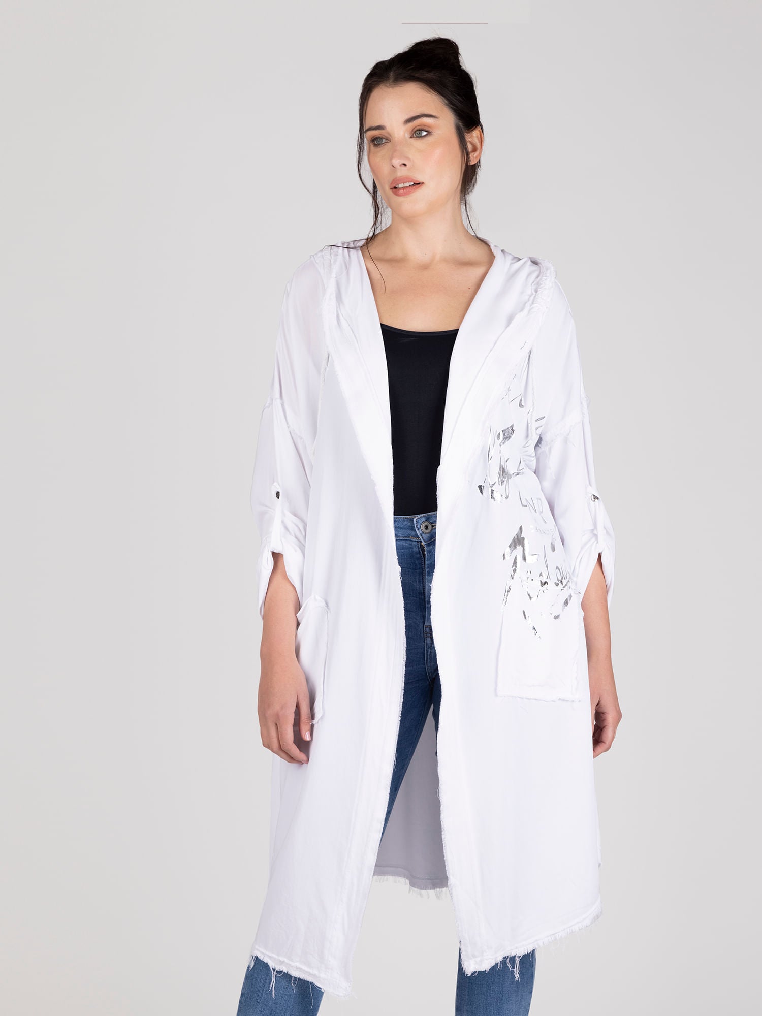 Spolverino o tapado largo, mangas 3/4 con botones para ajustar. Con detalle al lateral. Ideal para usar como sobretodo.