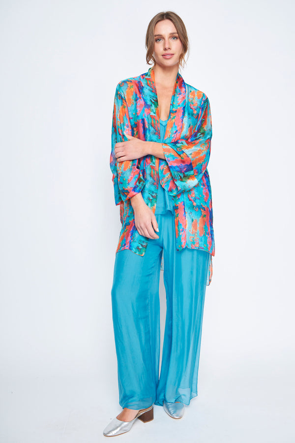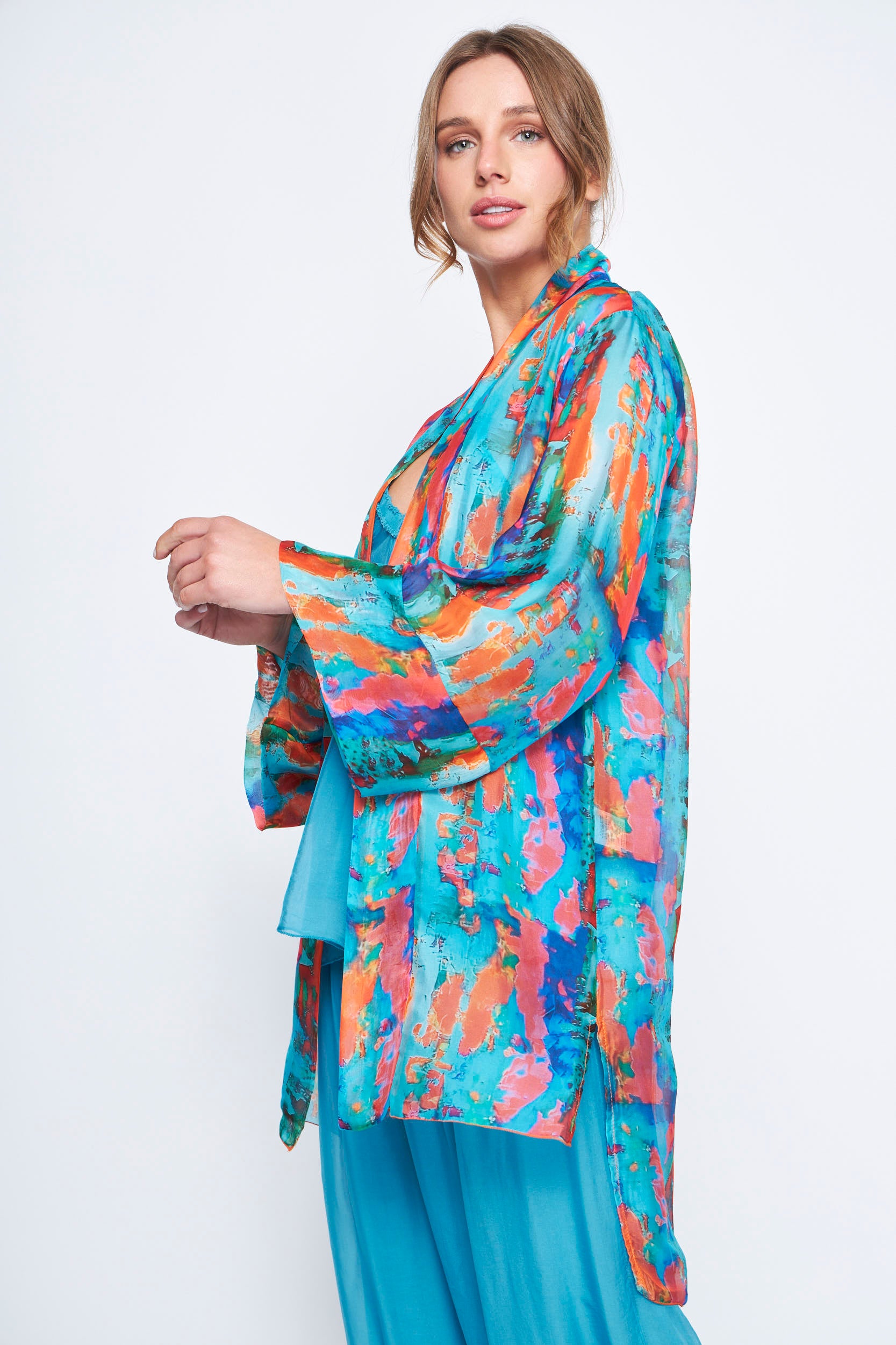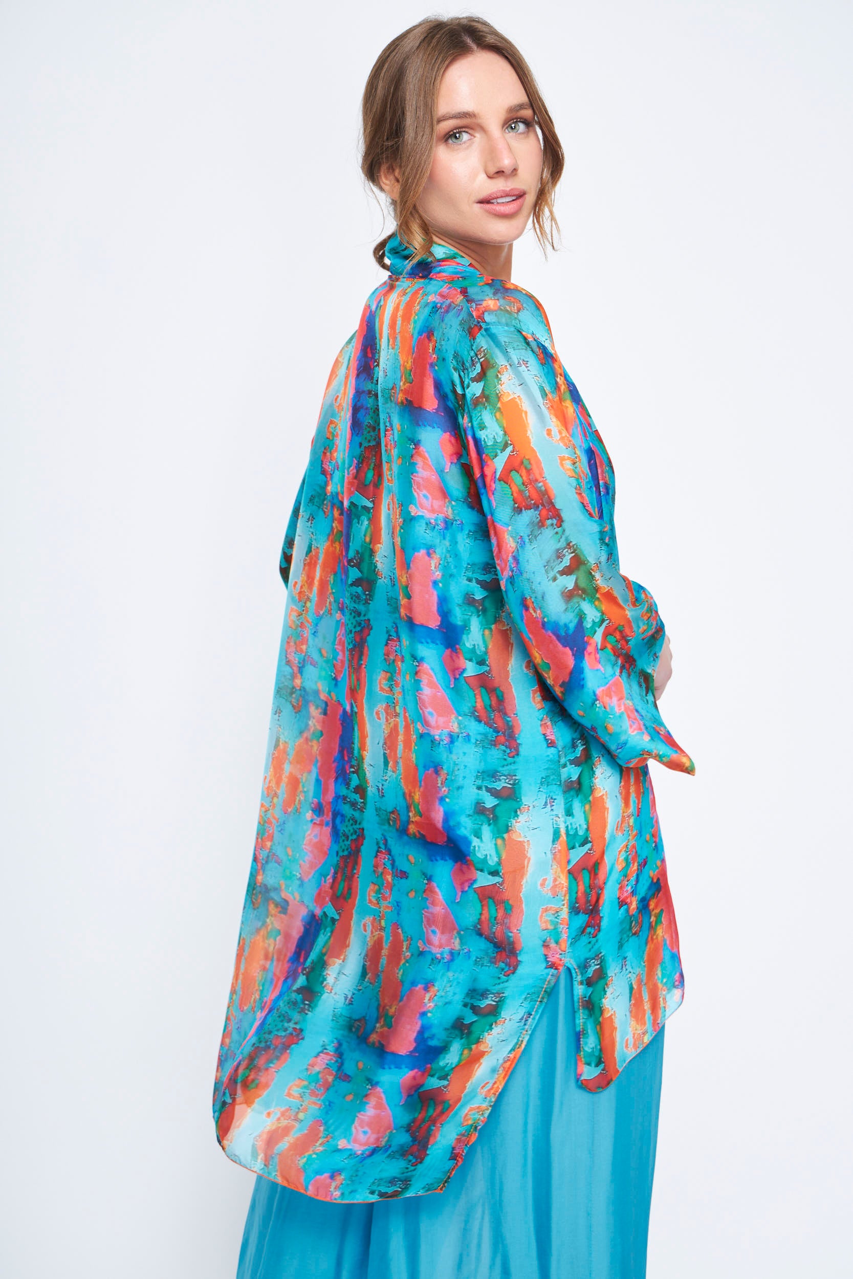 - Descripción: Este spolverino fluido de manga larga es una prenda versátil y elegante, perfecta para añadir un toque de color a cualquier atuendo. Su diseño con sublimación colorida lo convierte en una pieza única y llamativa.