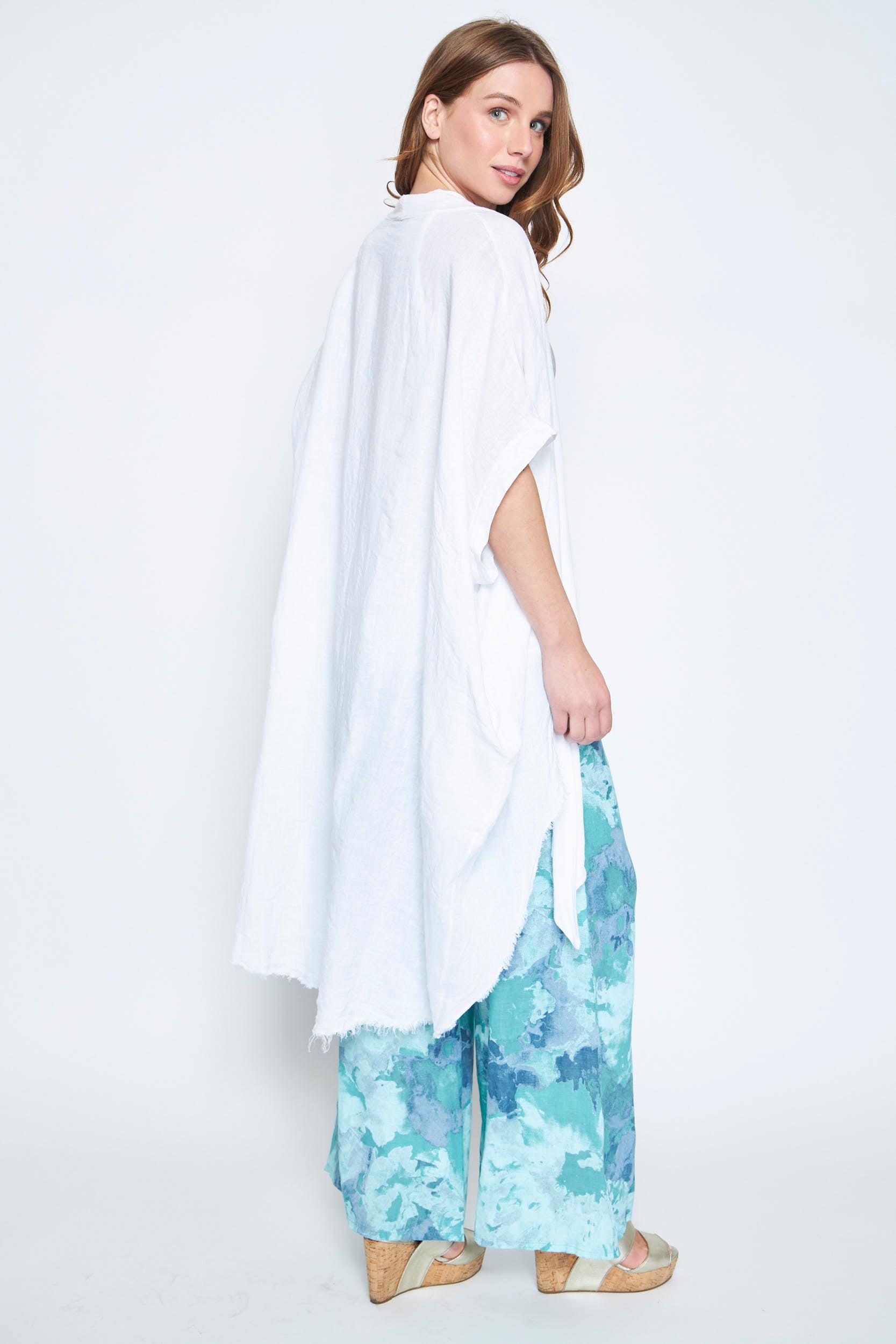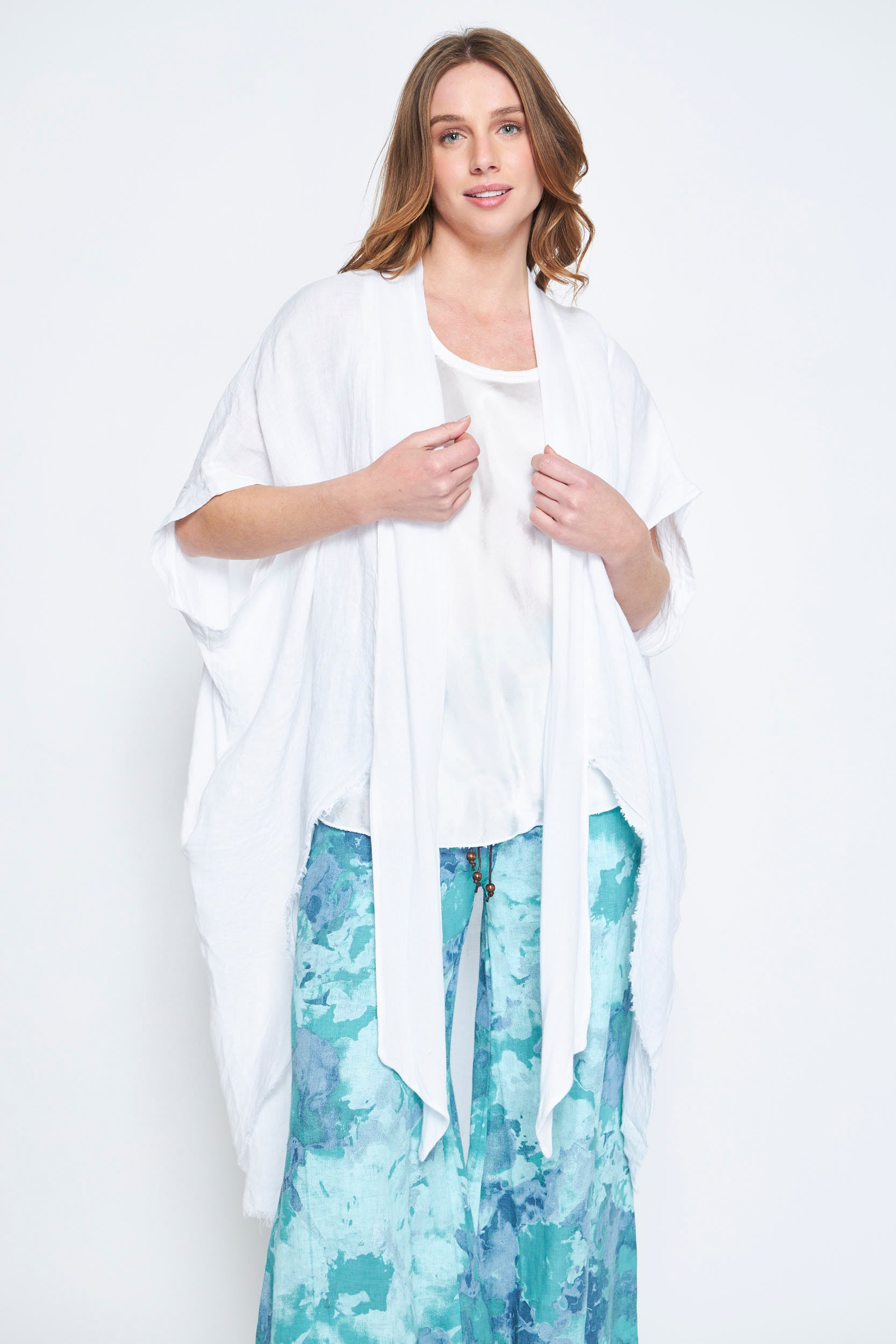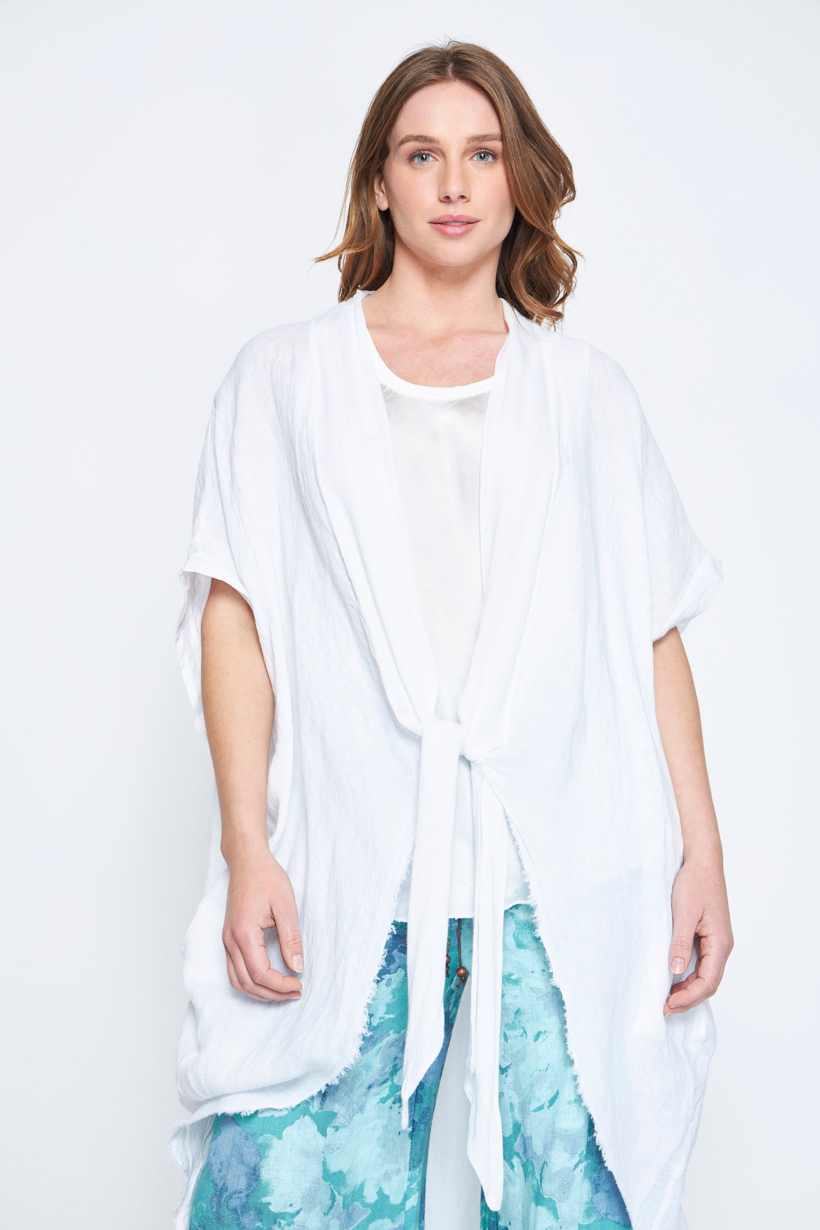 - Descripción: Este elegante spolverino de lino es la prenda perfecta para cualquier ocasión. Con su diseño anudado y mangas cortas, ofrece un estilo fresco y moderno. Su corte asimétrico, más largo en la parte trasera, añade un toque de sofisticación y movimiento a tu look.