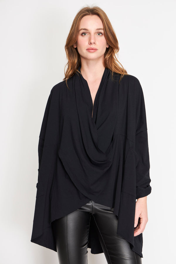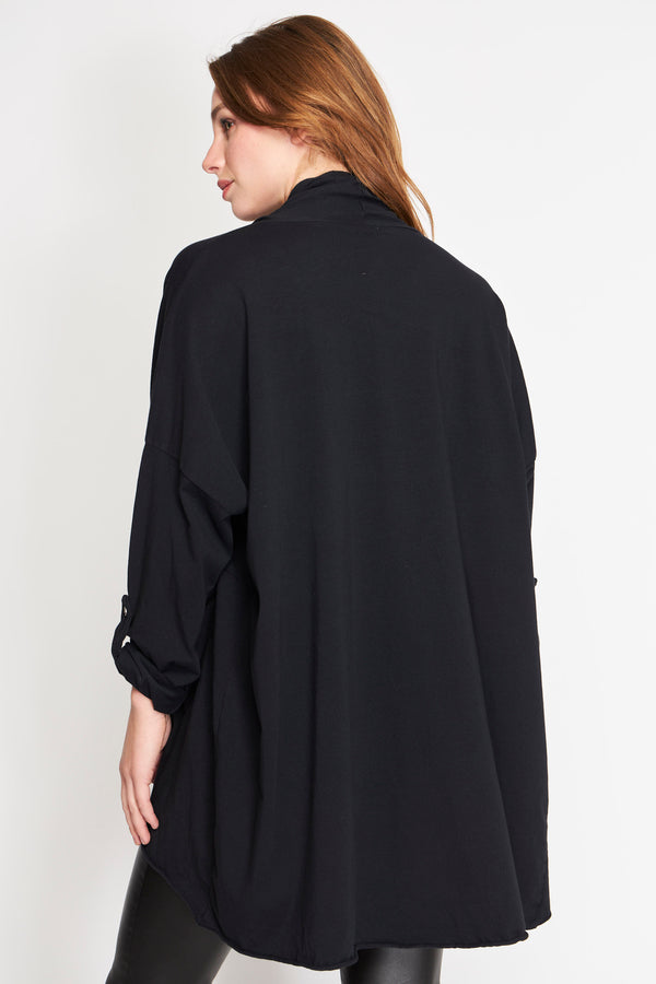 Spolverino asimétrico con cuello caído, perfecto para un look moderno. Combínalo con jeans y botas.