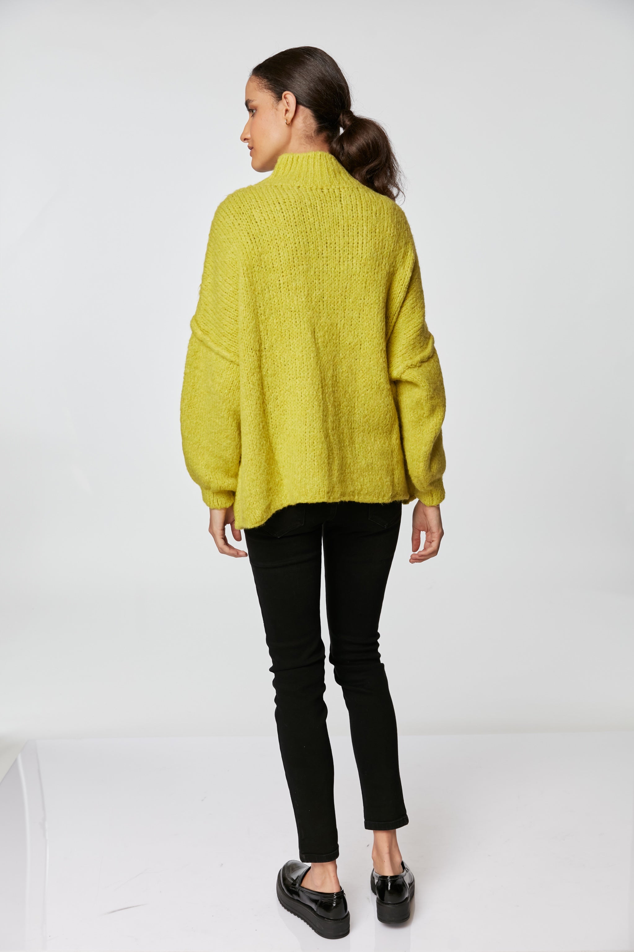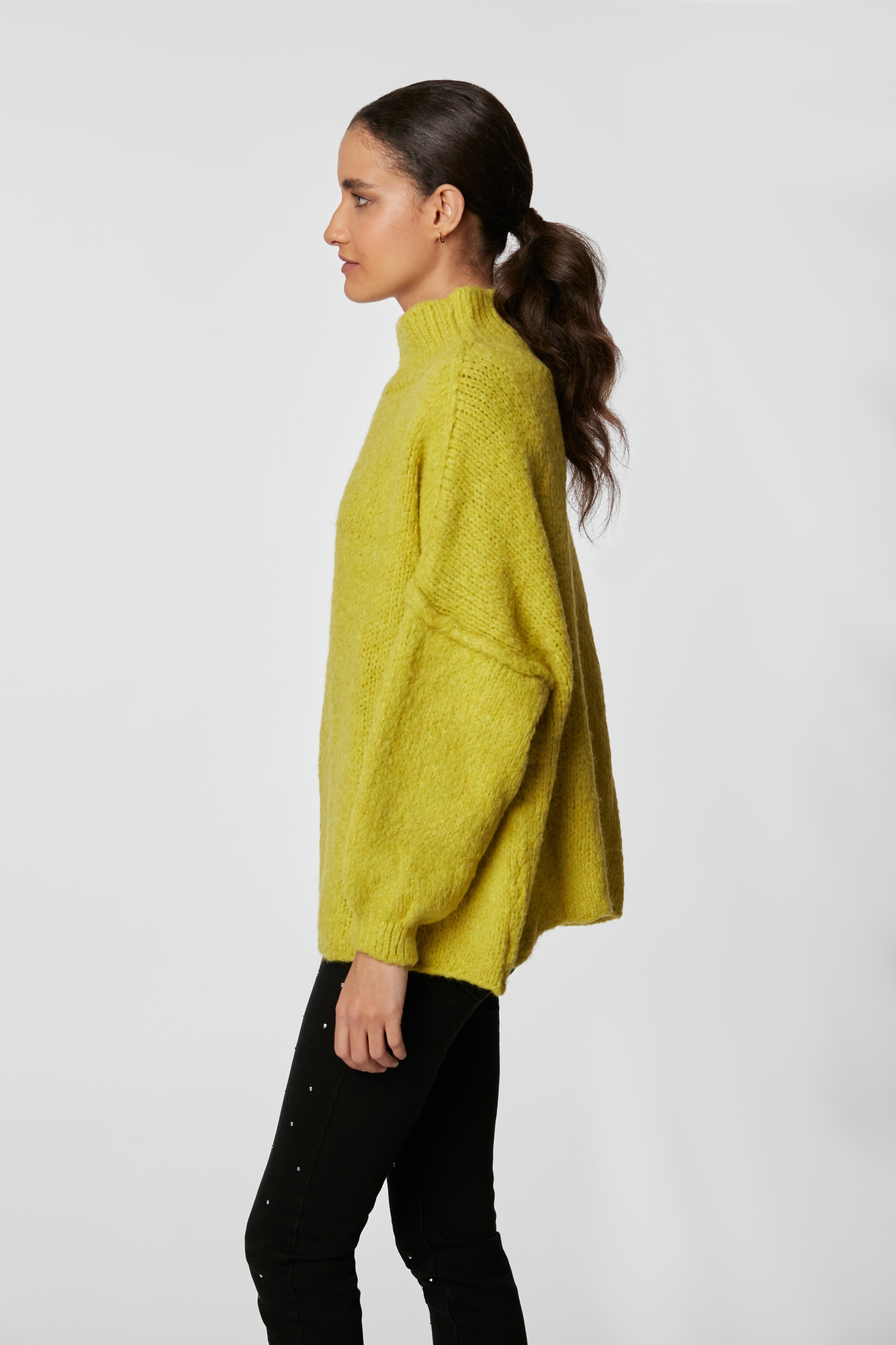 Sweater tejido grueso, cuello subido, ancho, cómodo y abrigado para los días de invierno.
