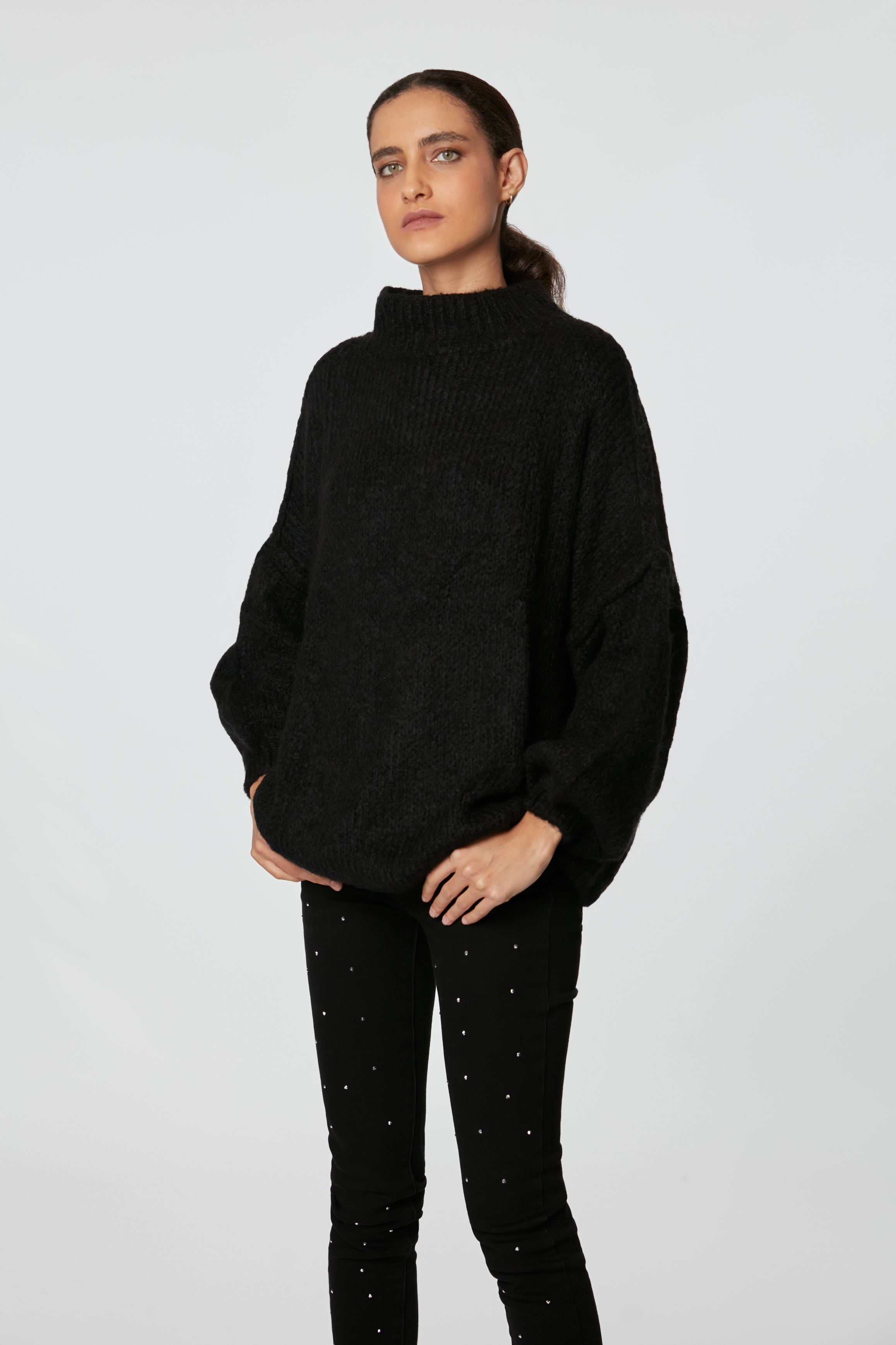 Sweater tejido grueso y cuello subido, de corte amplio, para mantenerte abrigada y confortable con un estilo sencillo.