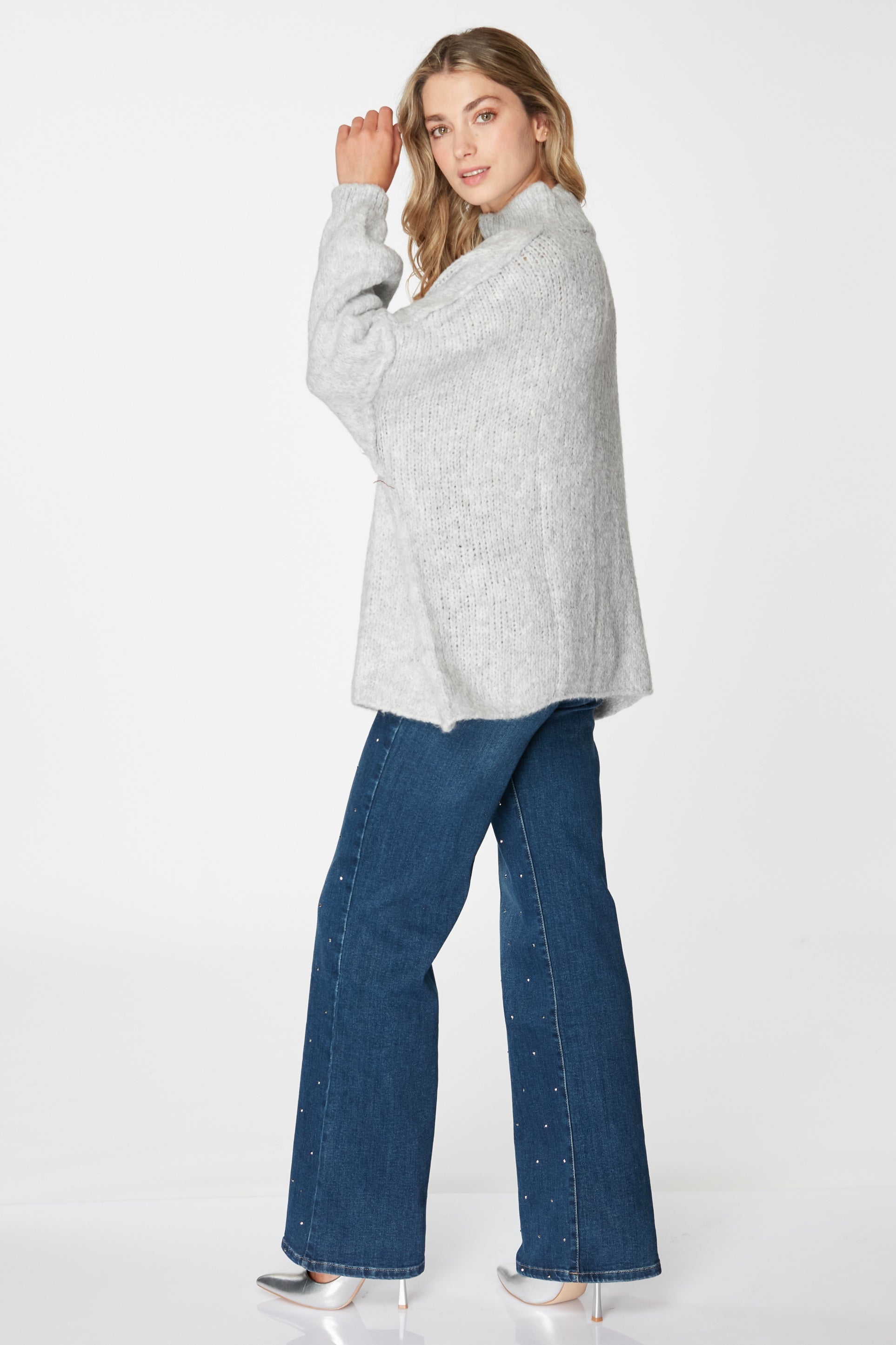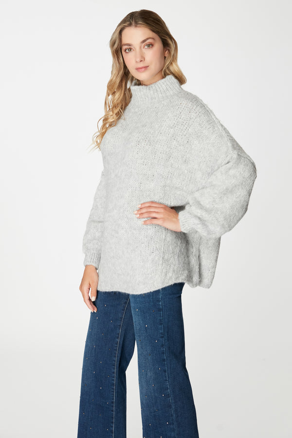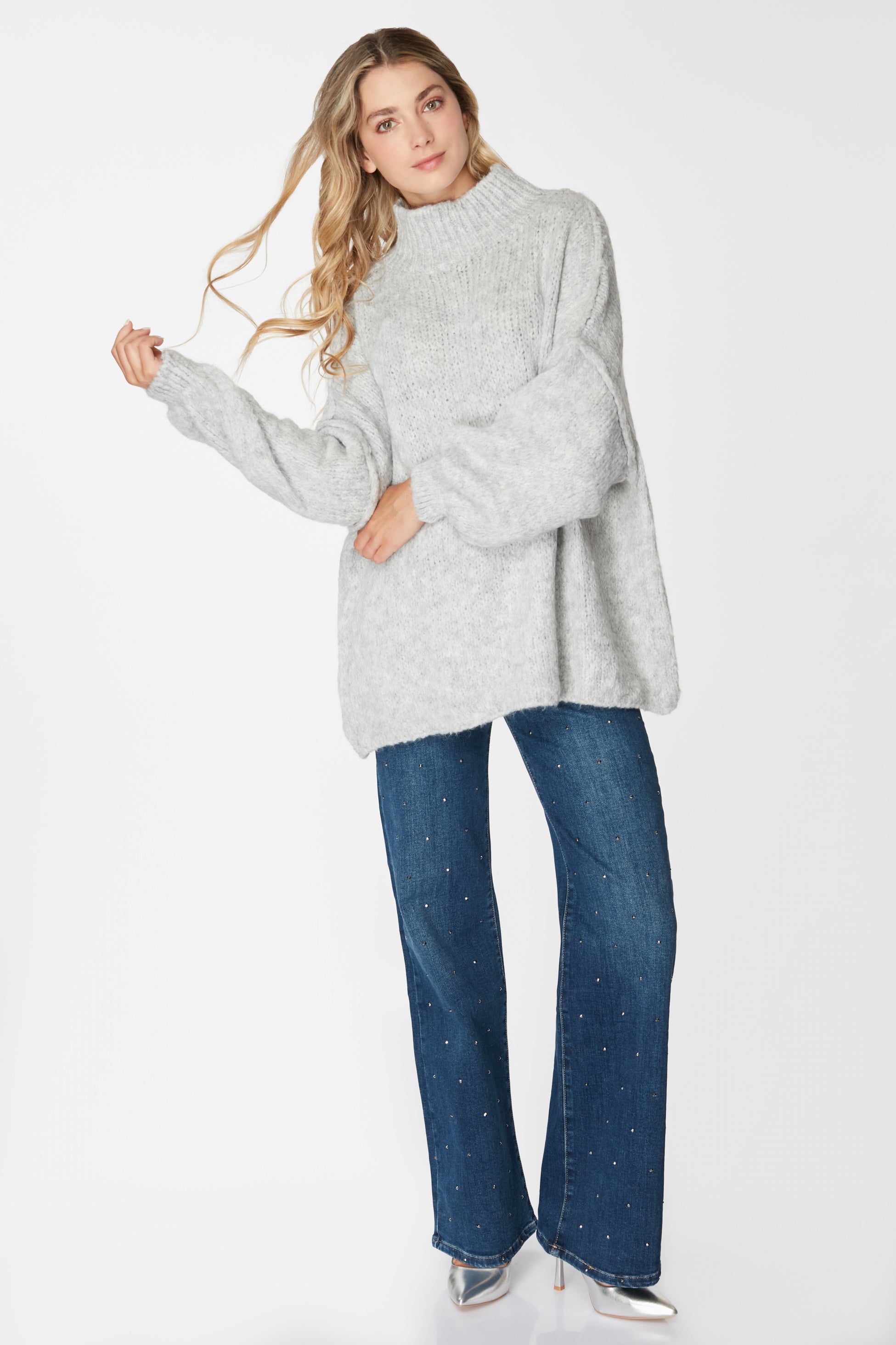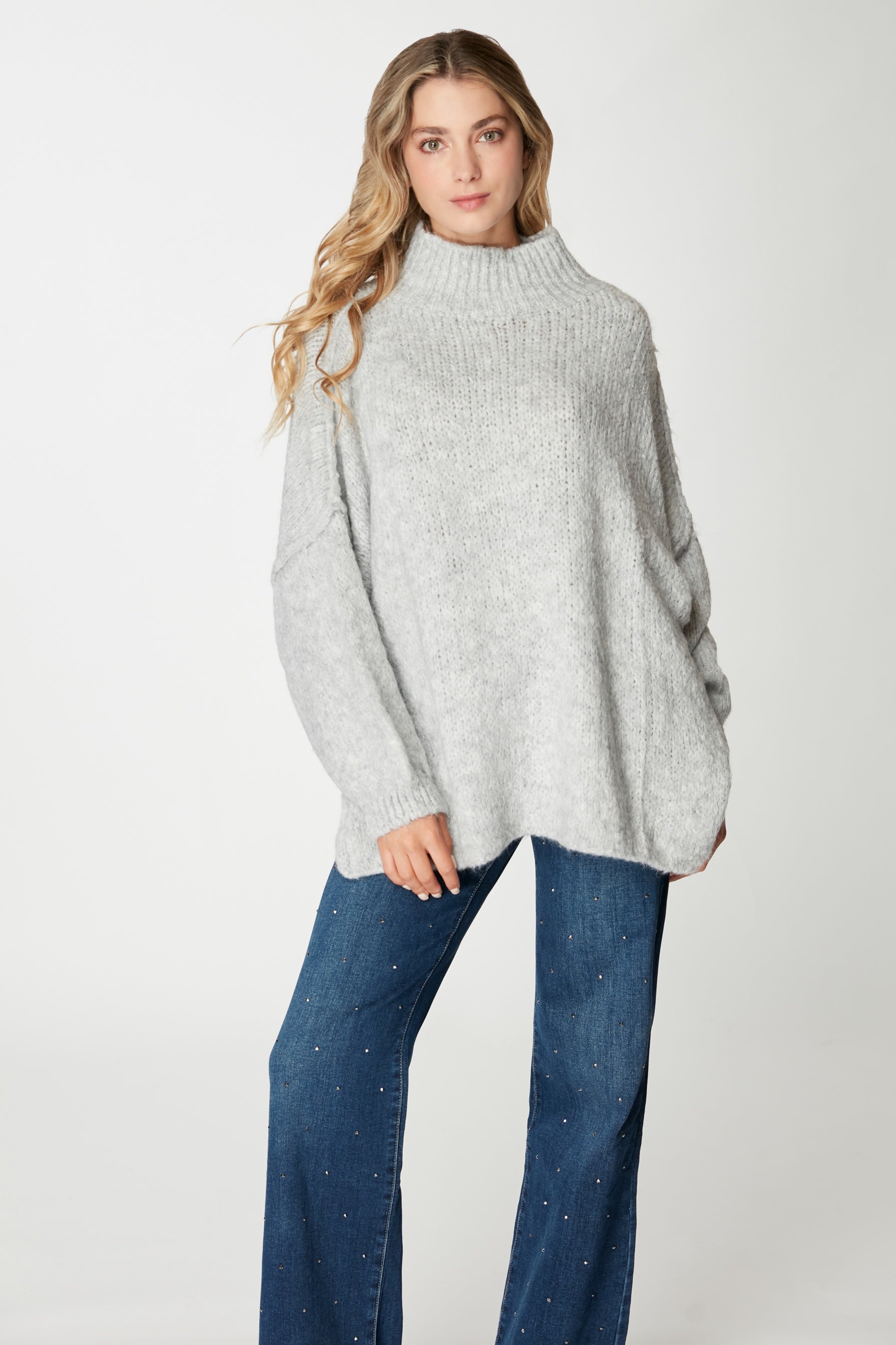 Sweater tejido grueso, cuello subido, ancho, ideal para un look relajado y acogedor.