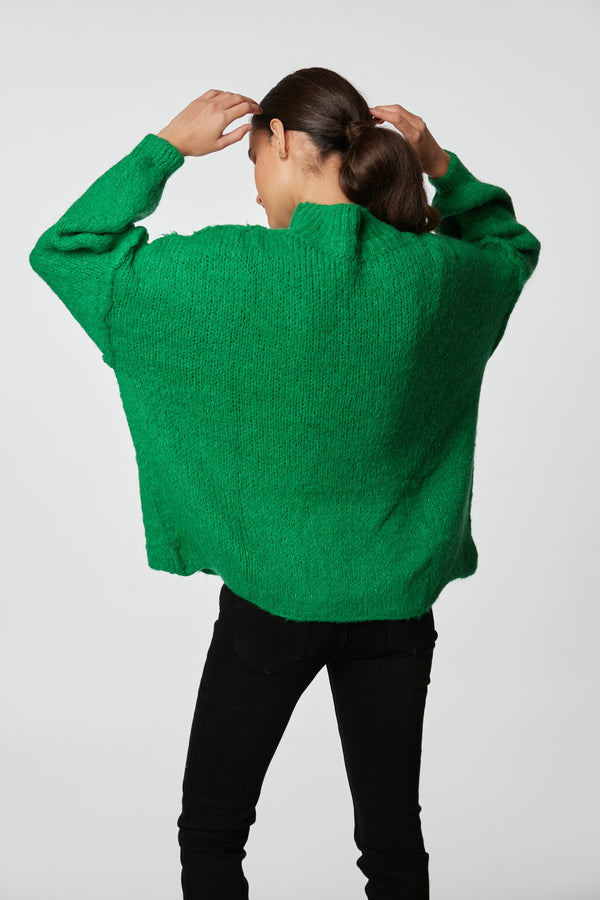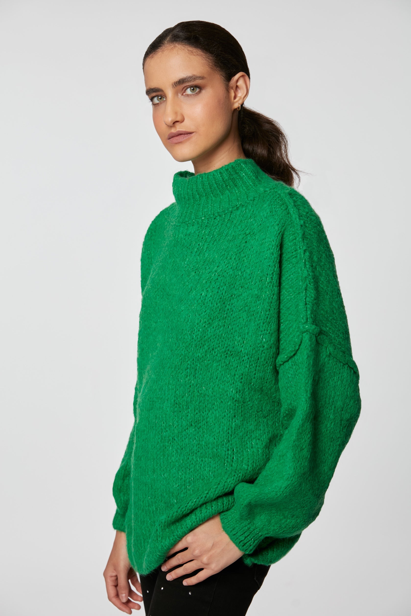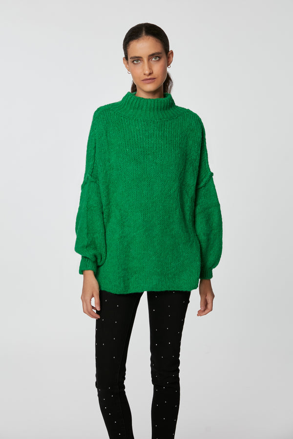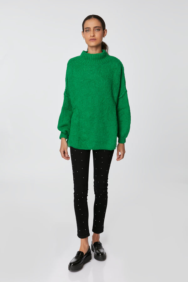 Sweater tejido grueso, cuello subido, ancho, una elección moderna y abrigada para tu closet de invierno.