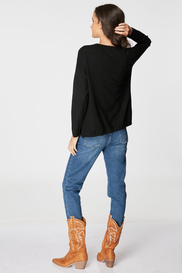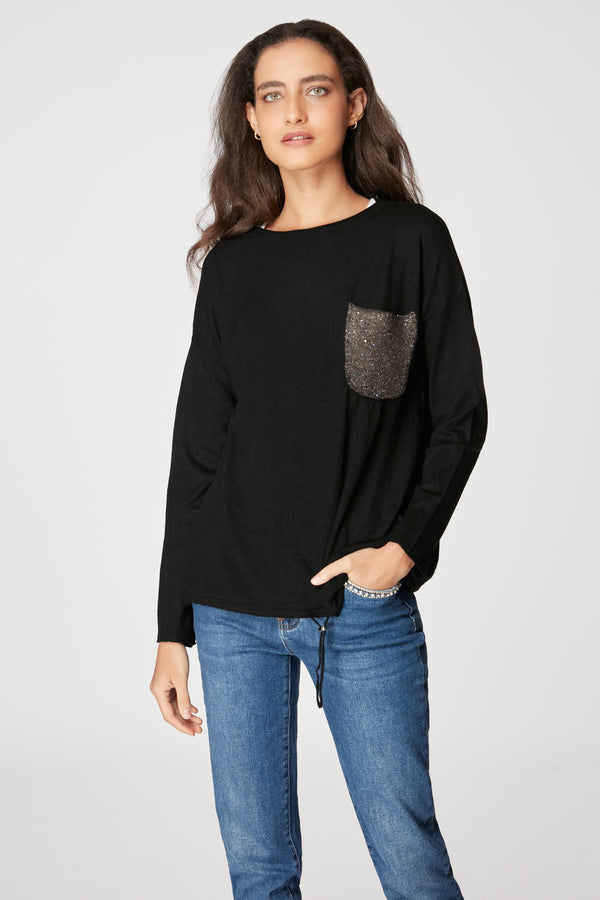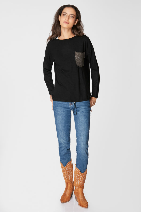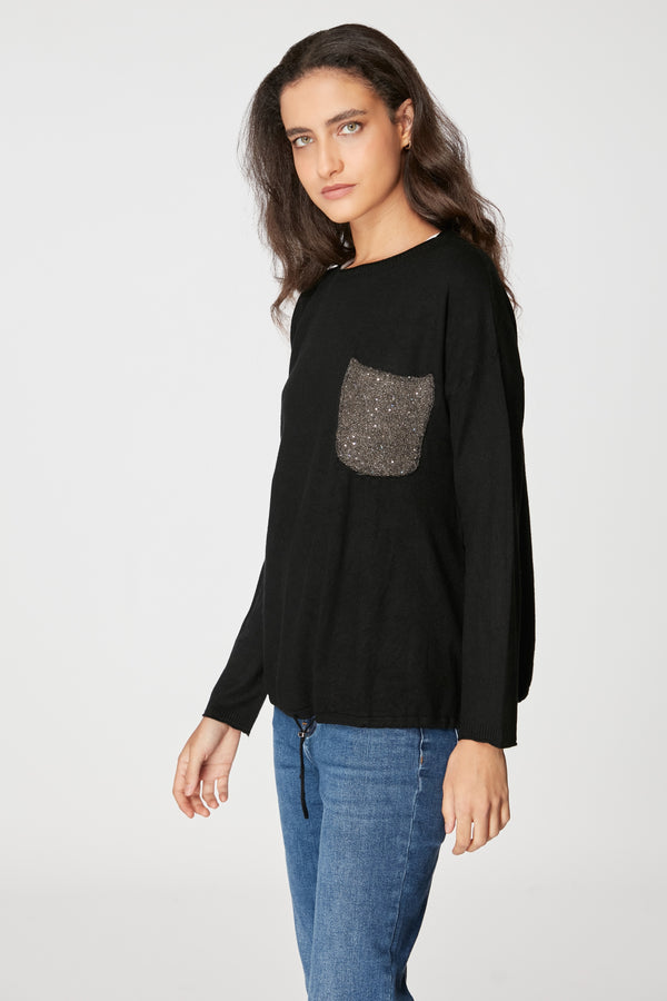 Sweater manga larga, cuello redondo, bolsillo delantero de tela brillante, elástico al final ajustable, ideal para un look sofisticado y chic.