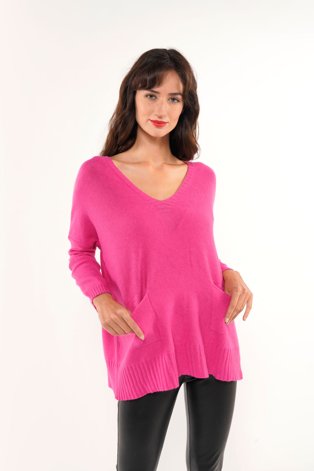 Sweater cuello en V, y bolsillos en frente. Holgado para una silueta mas suelta.