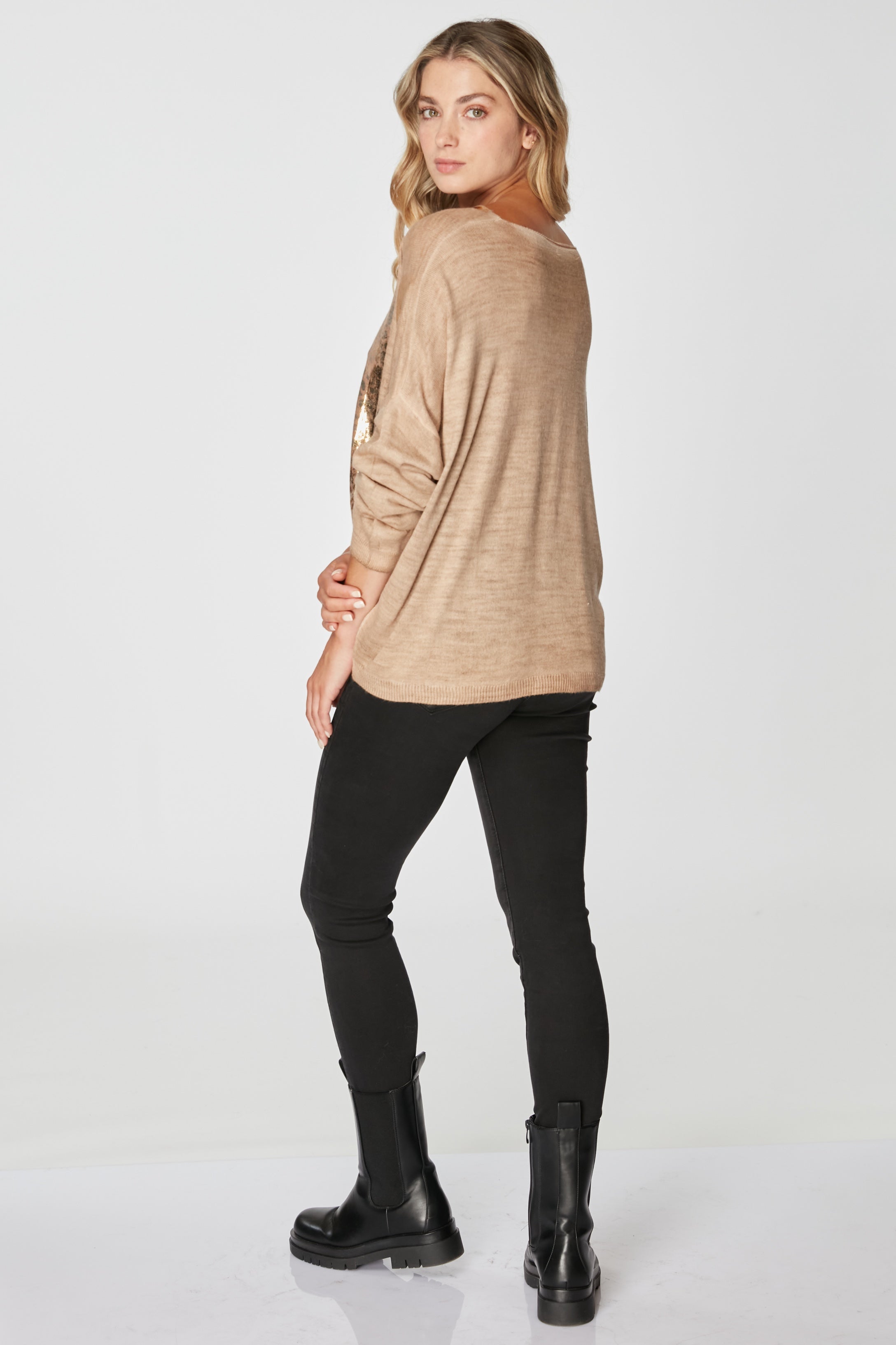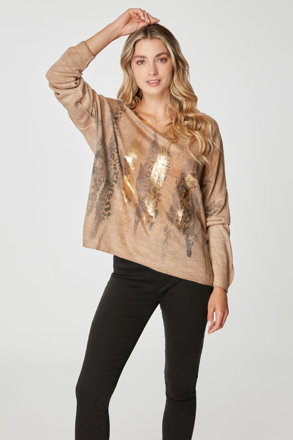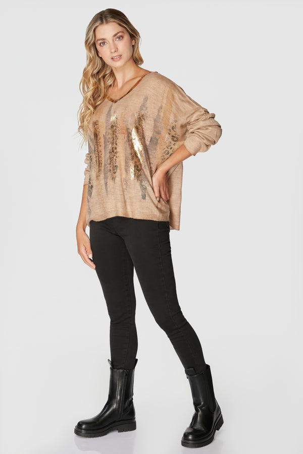 Sweater animal print con cuello en V y detalles de folia, agrega un toque brillante a un look casual.