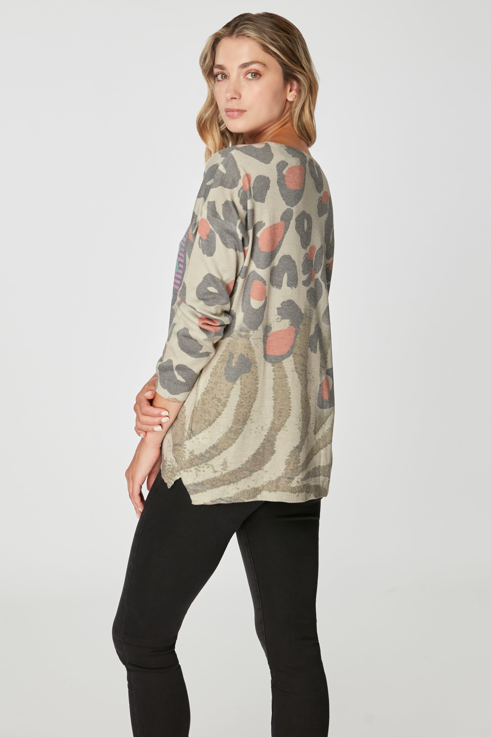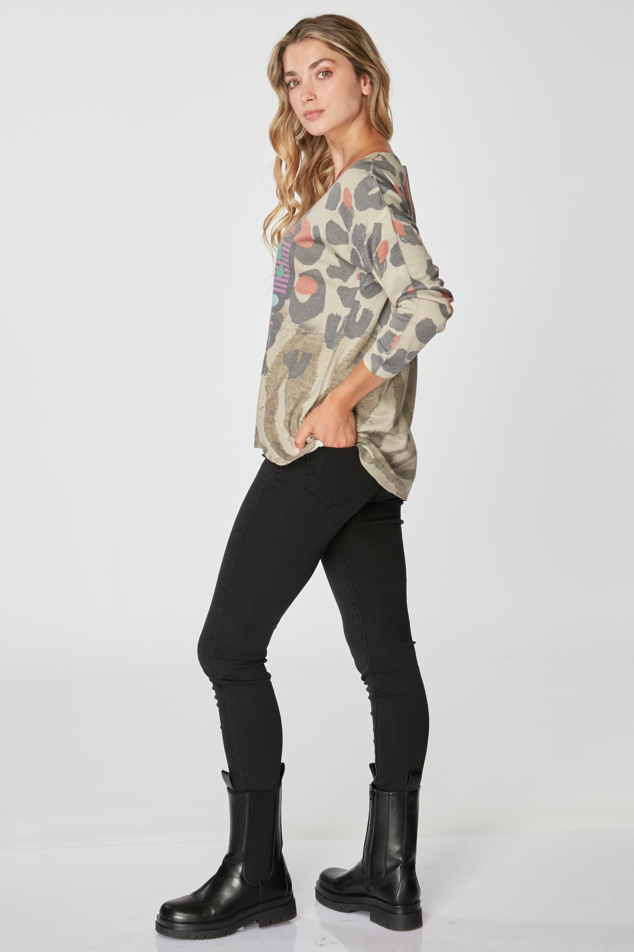 Sweater estampado con cuello en V y folia dorado, manga larga, combina calidez con un brillo discreto.