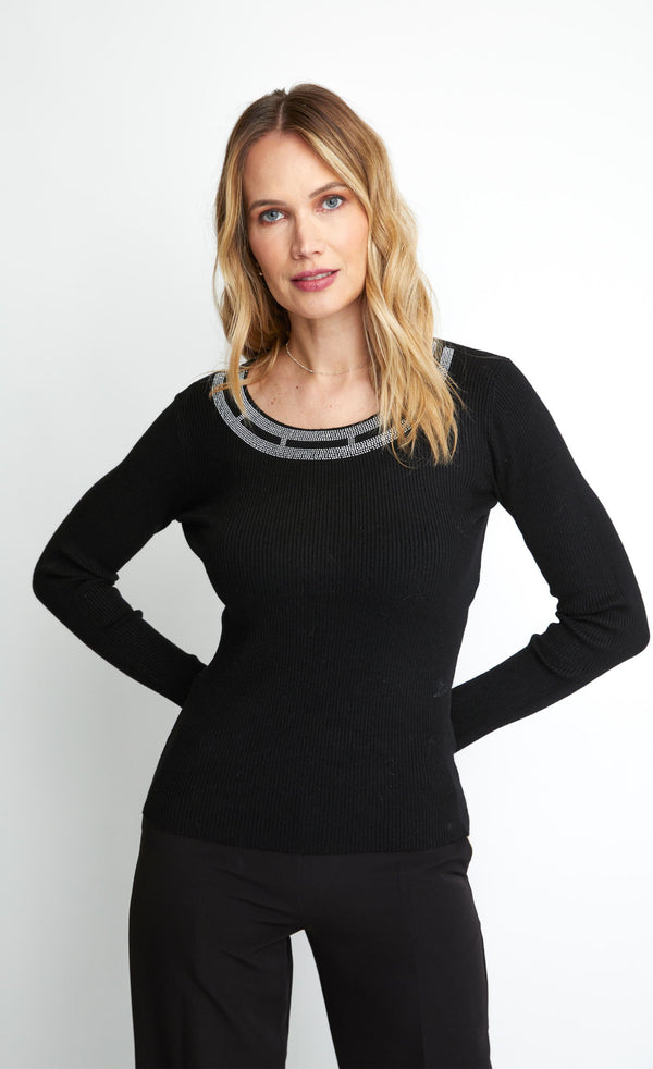 Sweater manga larga, cuello en U con detalle de piedras en cuello. Ideal para usarlo como básico de armario