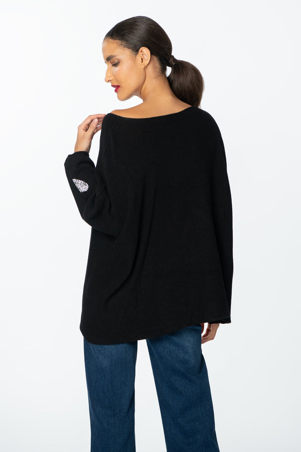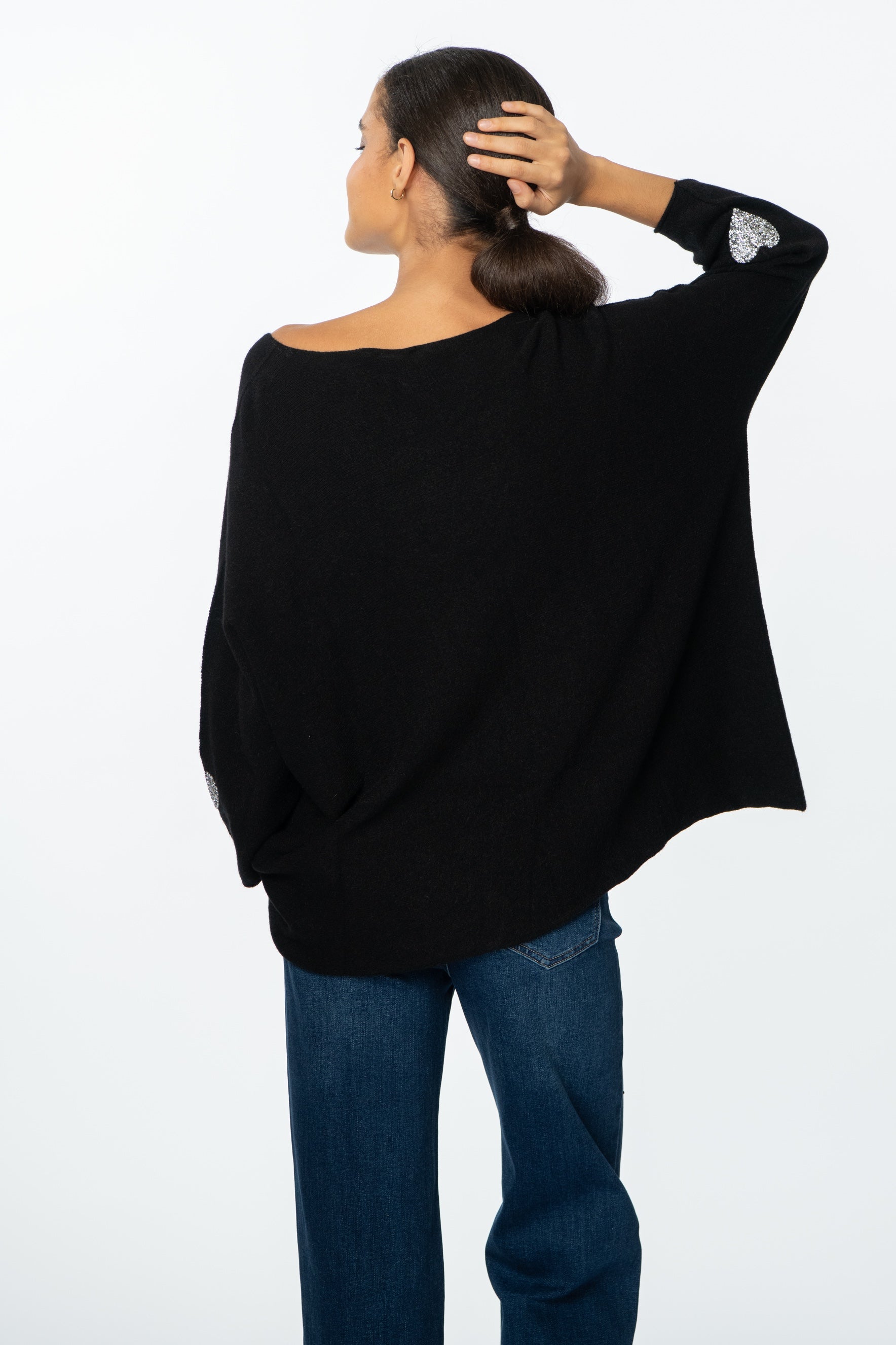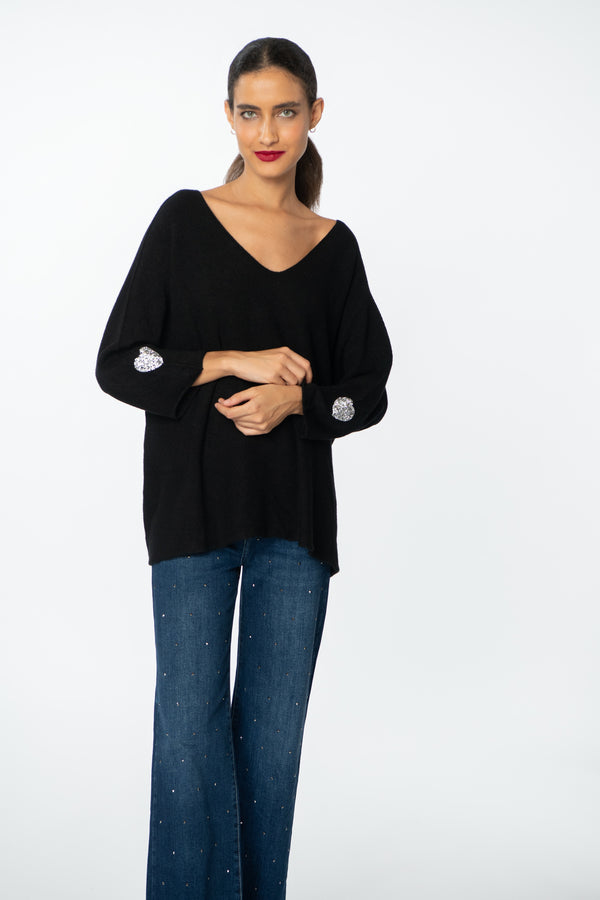 Sweater ancho con cuello en V y corazones brillantes en las mangas, para añadir un toque divertido a tu closet.