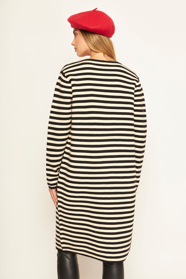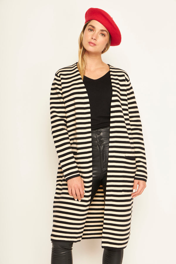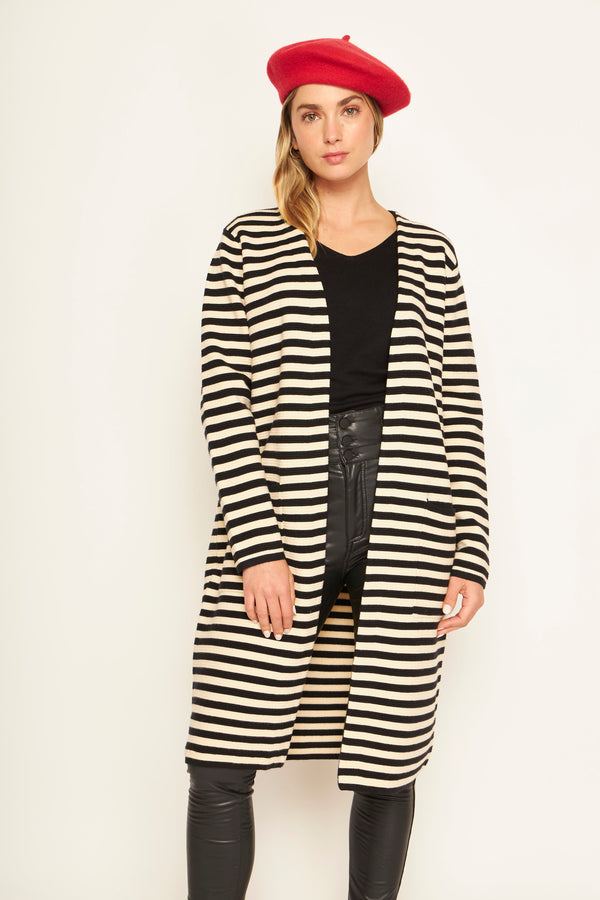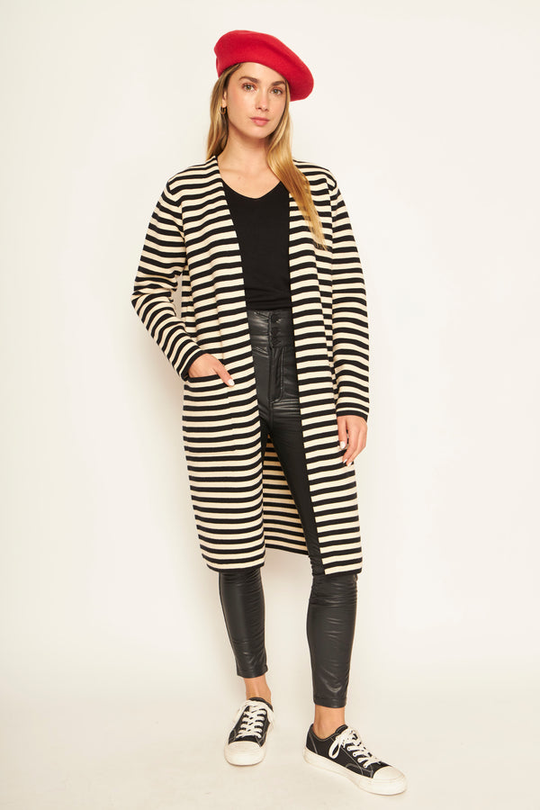 Cardigan largo tejido de punto blanco y negro, con bolsillos delanteros, cómodo y versátil para tus looks de temporada.