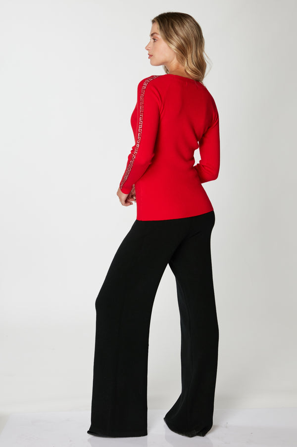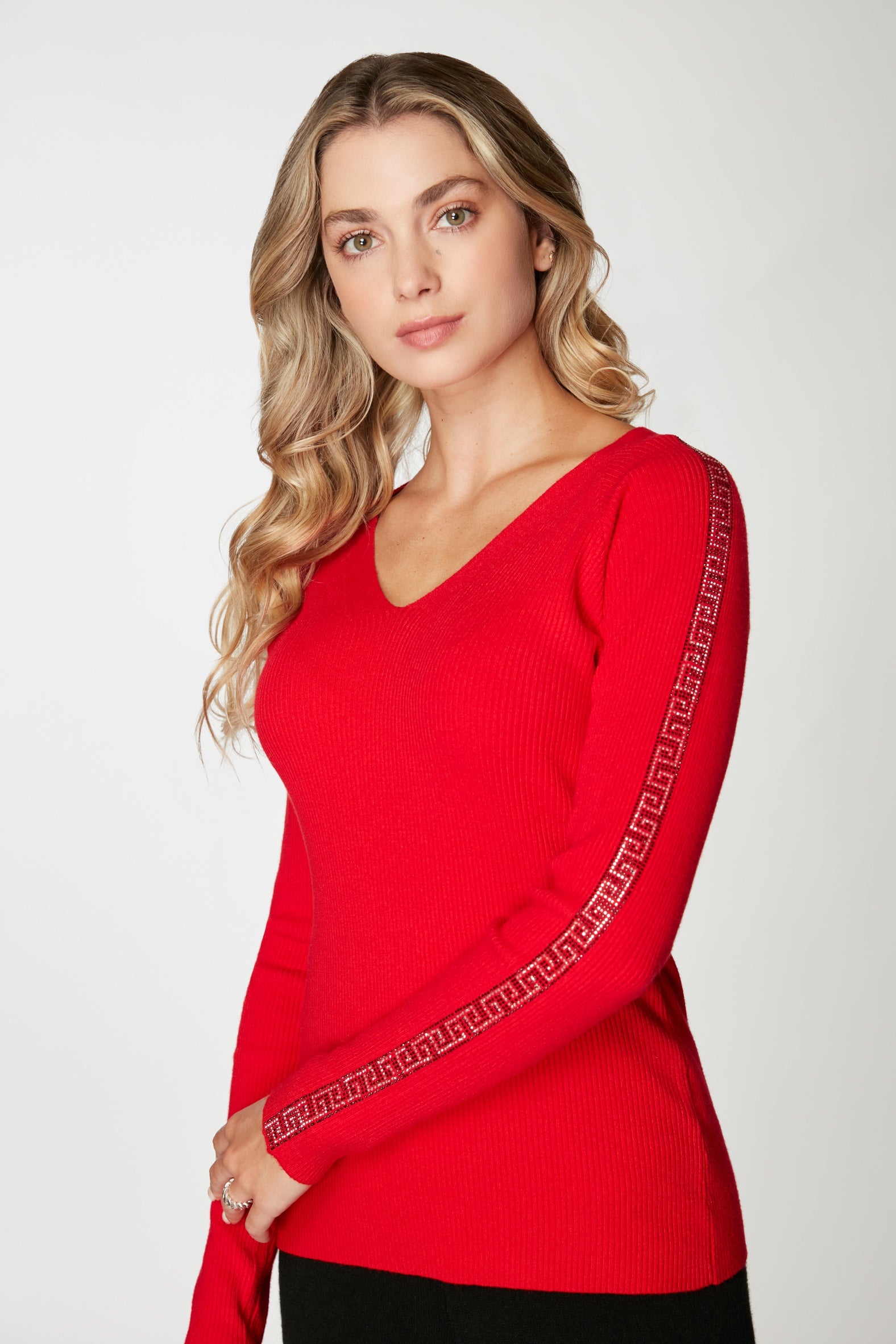 Sweater con cuello en V y aplicaciones brillantes en las mangas, ideal para iluminar tu look de oficina o para una salida nocturna.