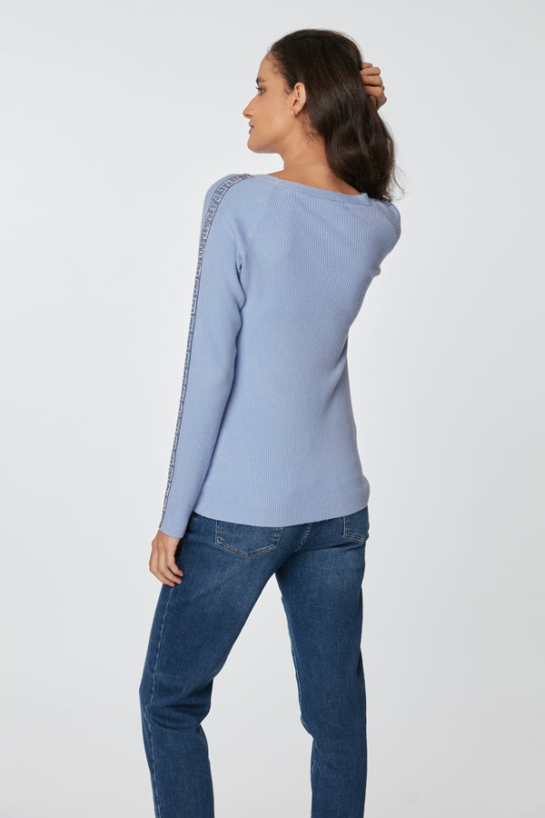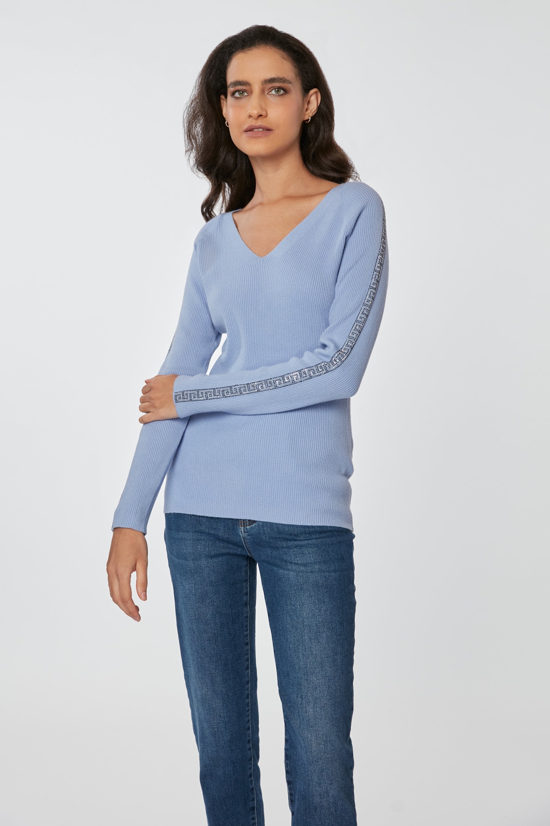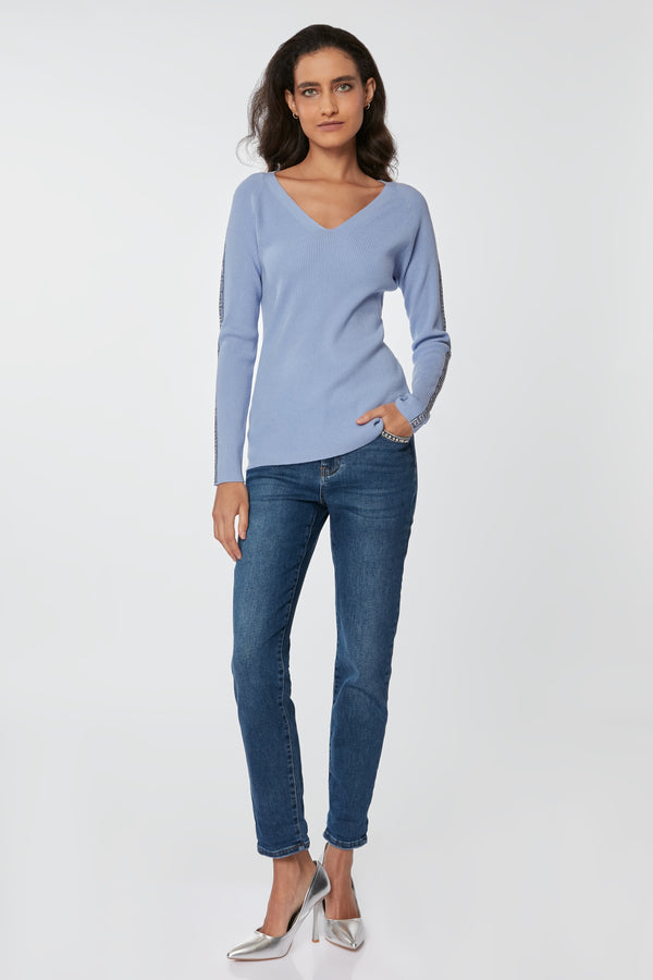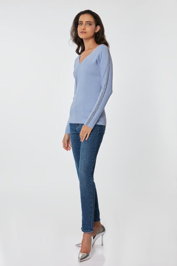 Sweater de cuello en V ajustado al cuerpo, con aplicaciones de brillos en las mangas, combina estilo con comodidad para cualquier ocasión.