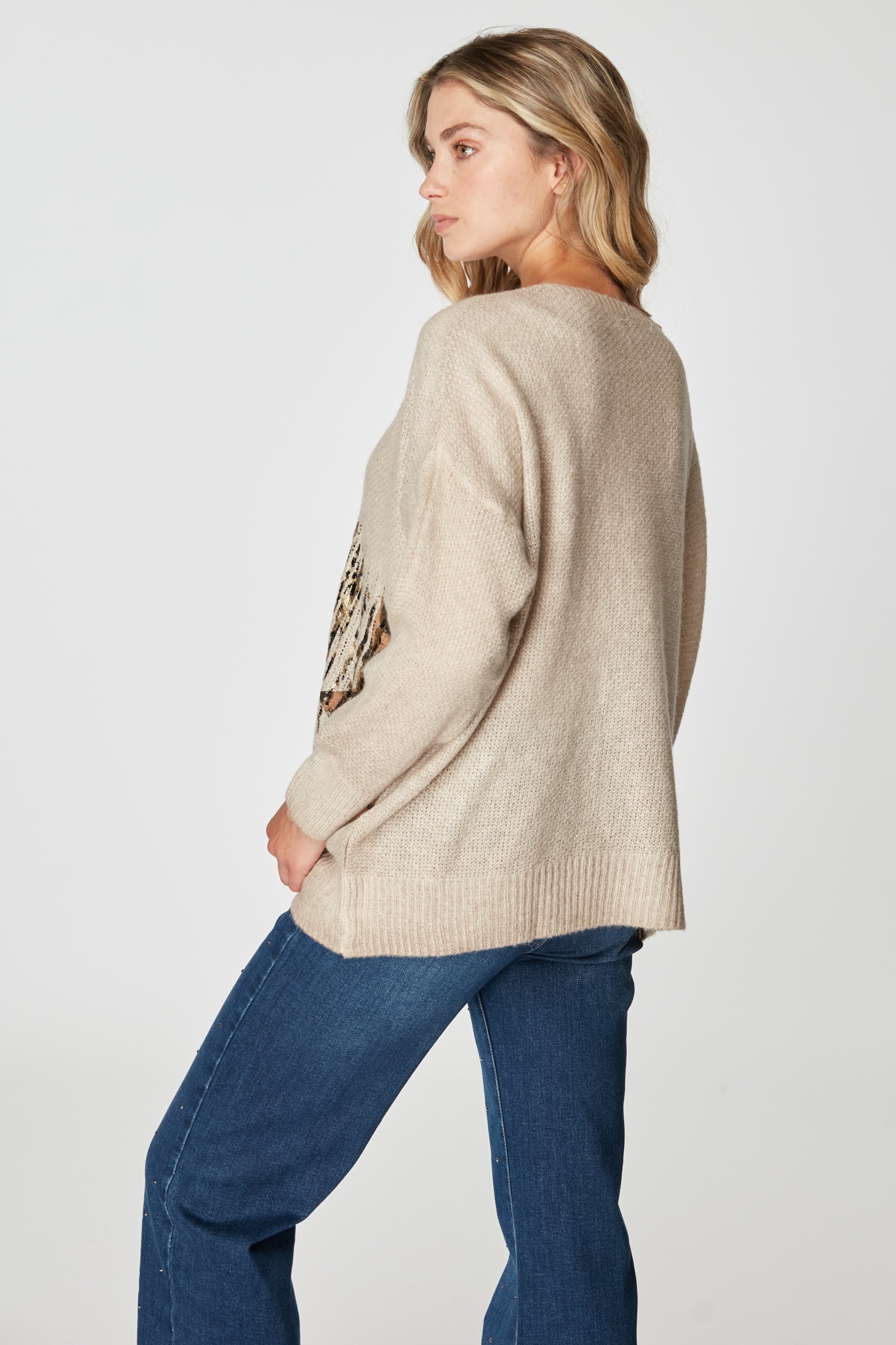 Sweater con cuello en V y detalles dorados, mezcla la tendencia del animal print con la comodidad para cualquier ocasión.
