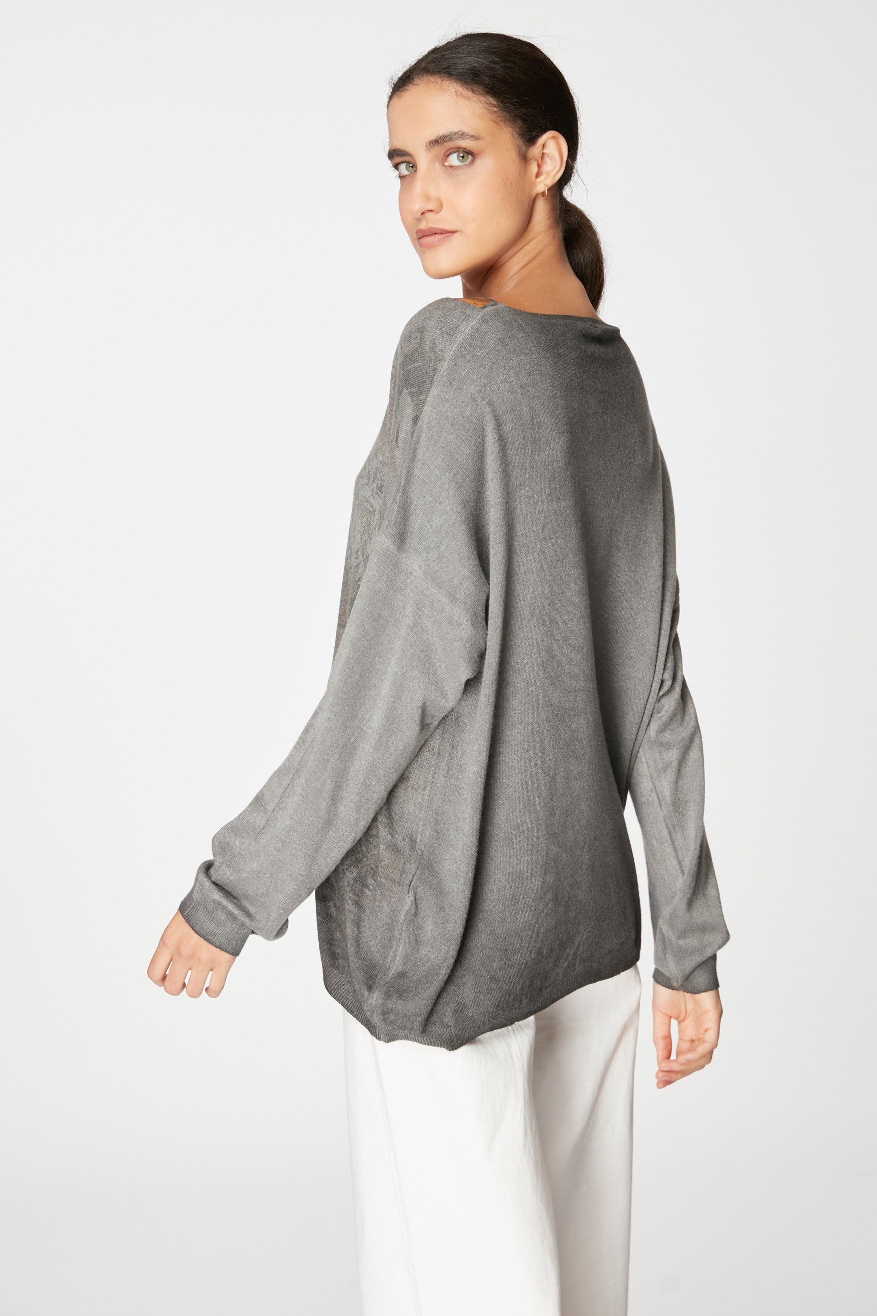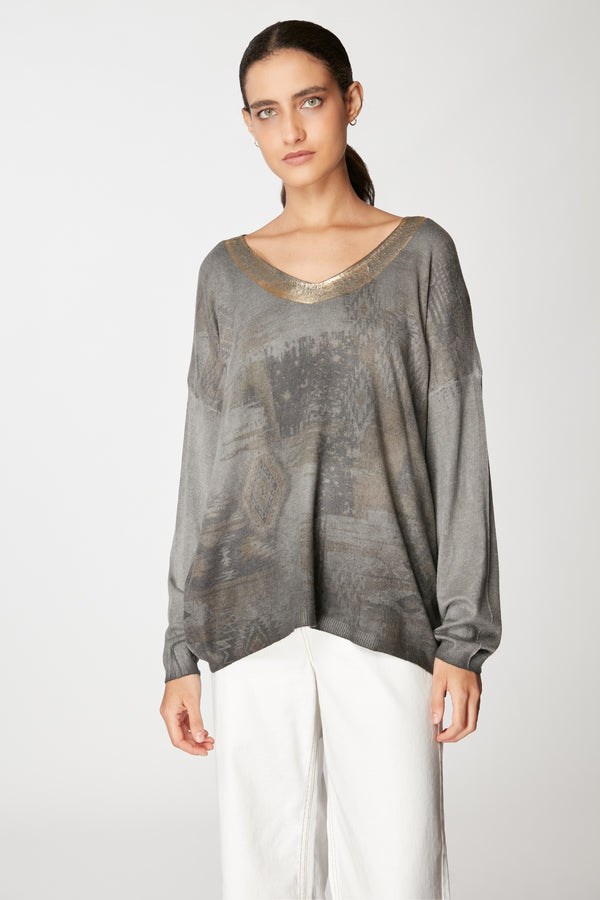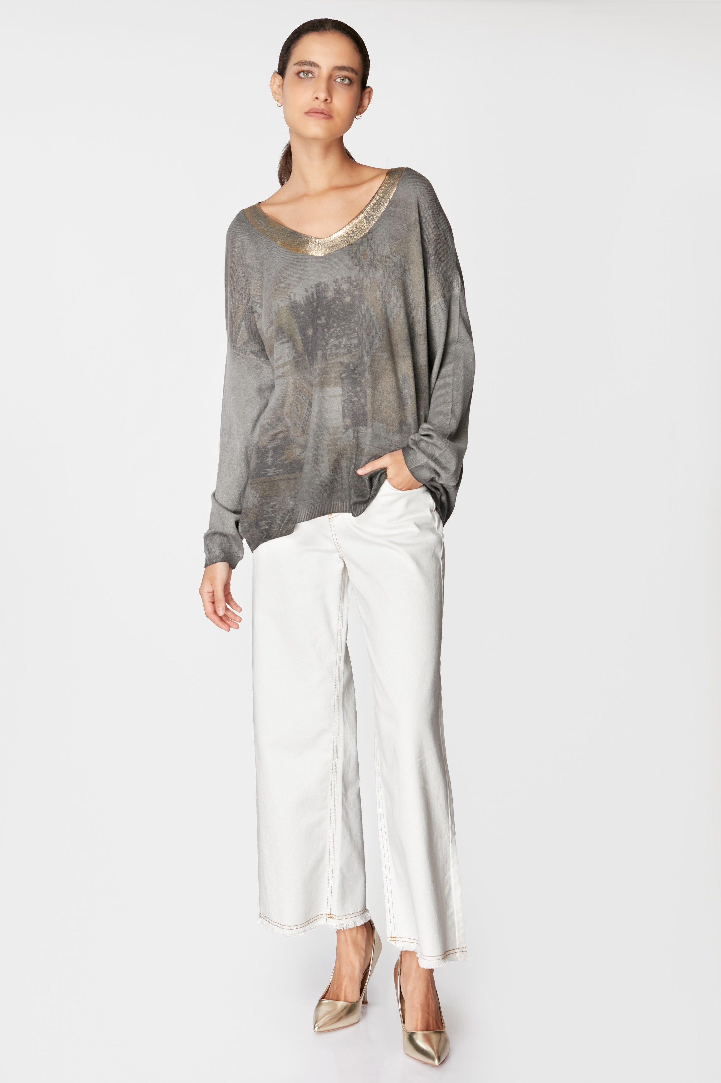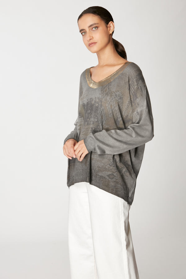 Sweater estampado sutil, cuello redondo con detalle de folia, manga larga, una elección versátil y moderna para el frío.