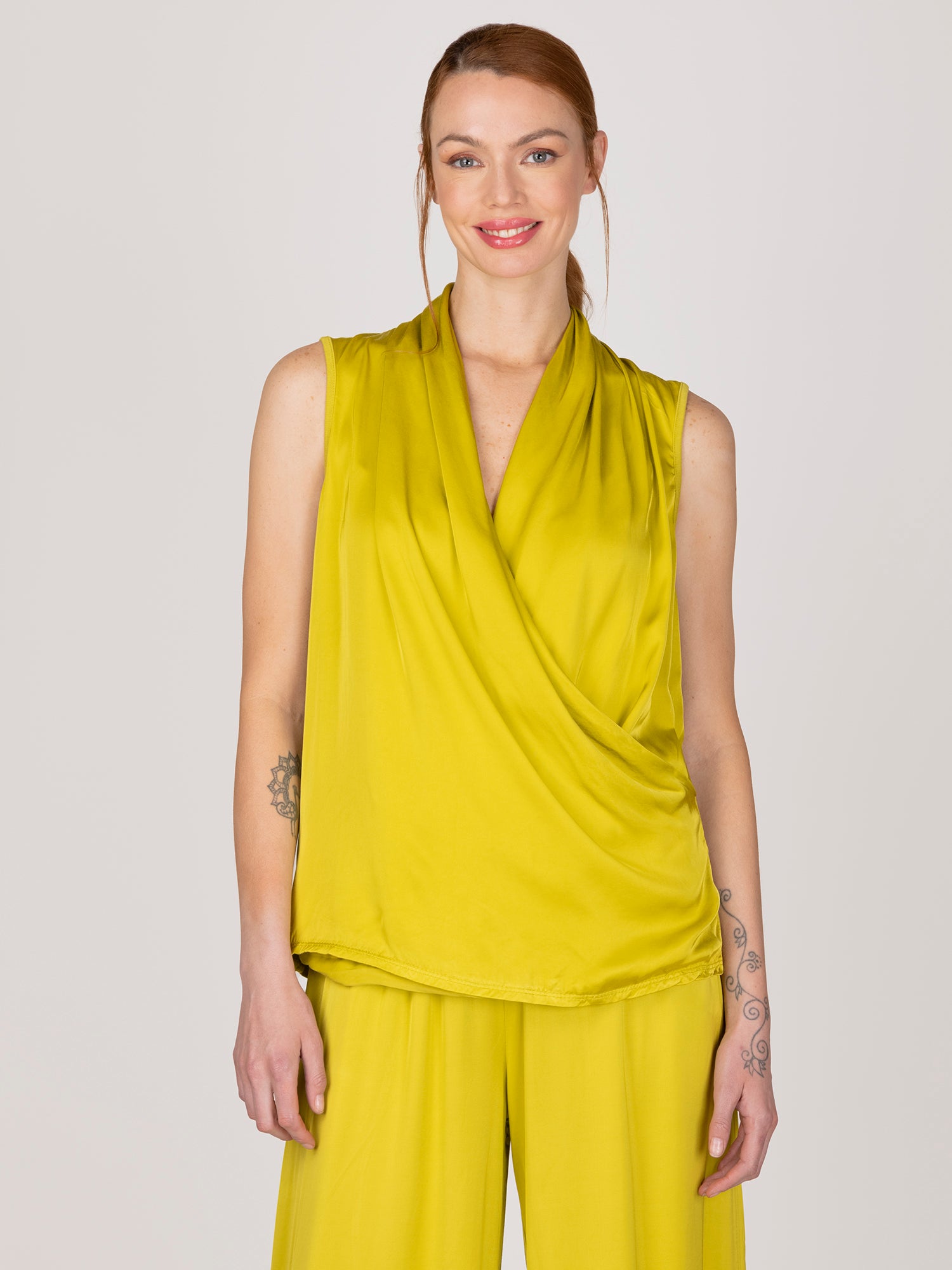 Top sin mangas cruzado con acabado satinado. Ideal para cualquier ocasión.