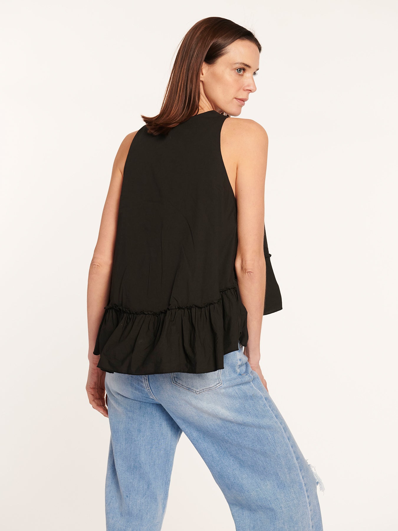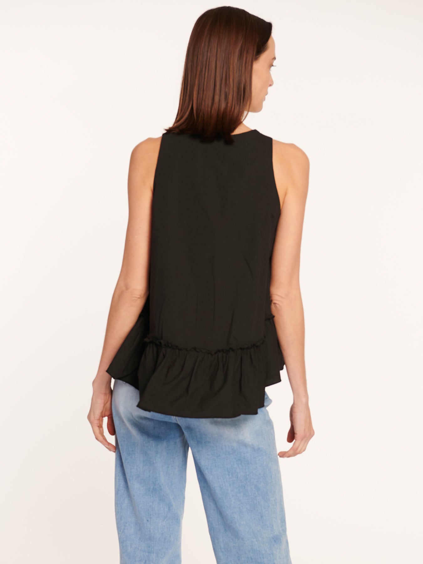 Polera sin mangas, cuello en punta, con vuelo en la parte inferior para dar un delicado volumen en las caderas.