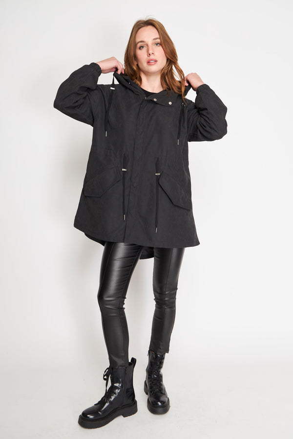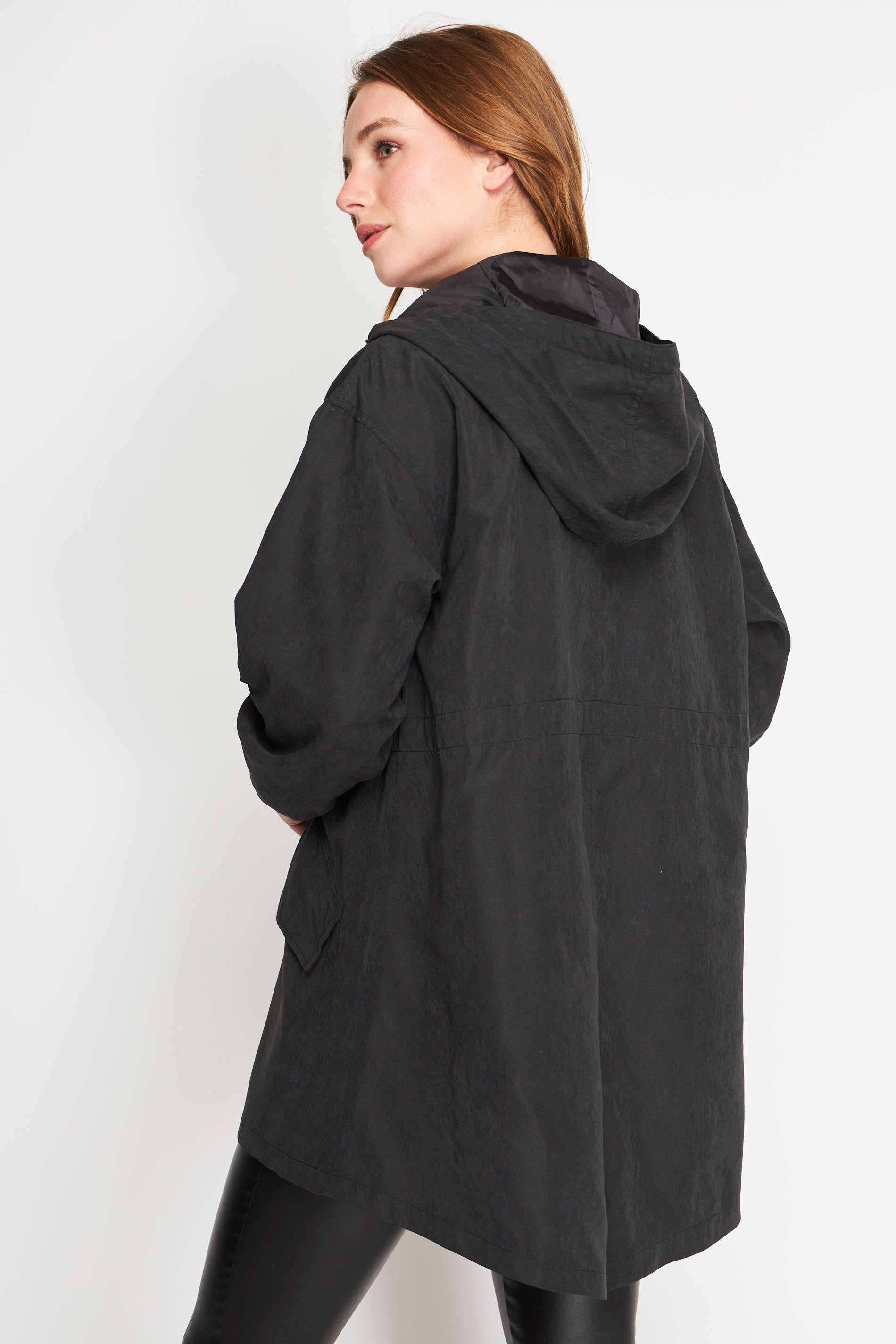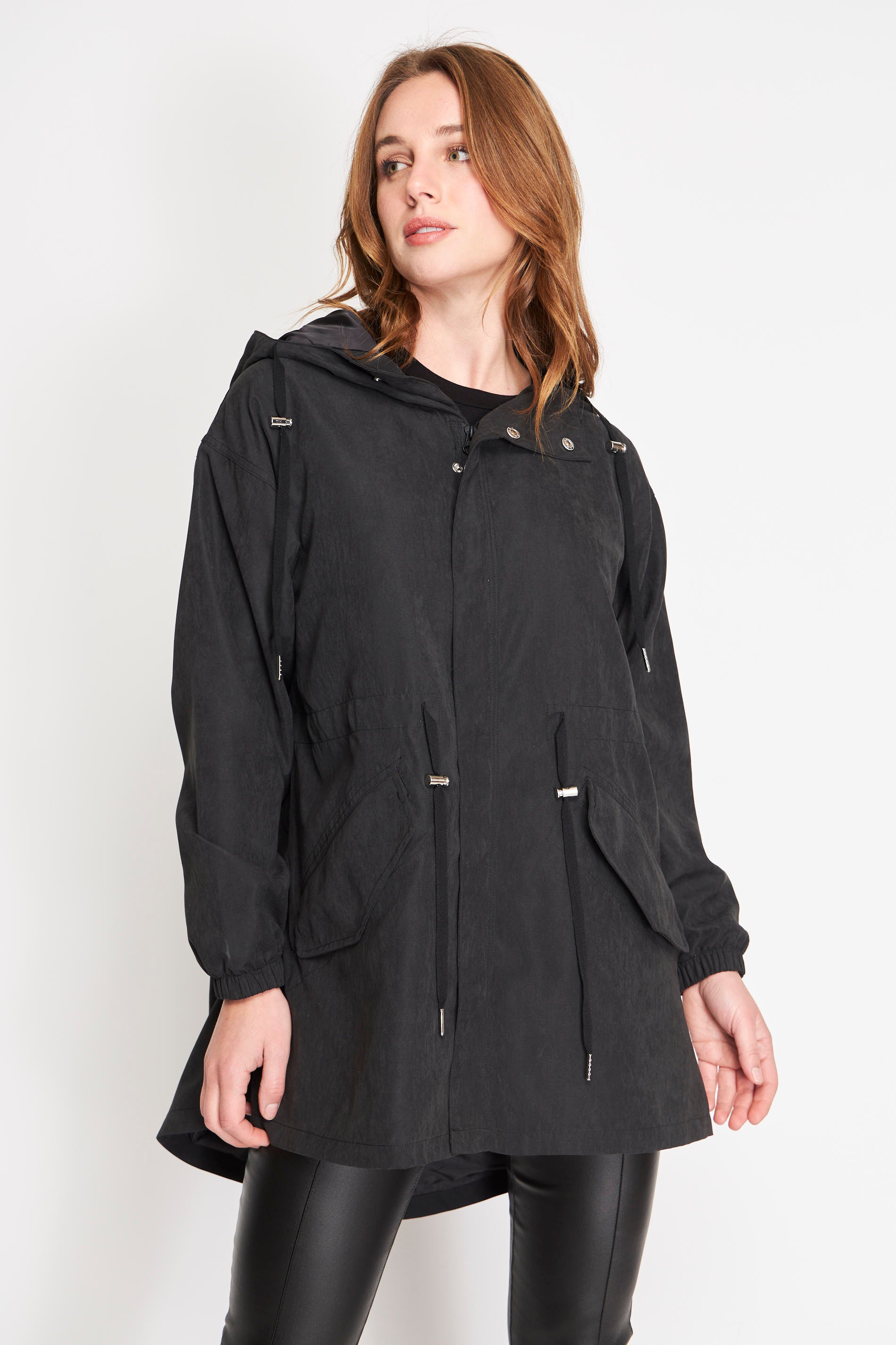 Trench con bolsillos y capucha, perfecto para días lluviosos. Úsalo con botas y un paraguas.