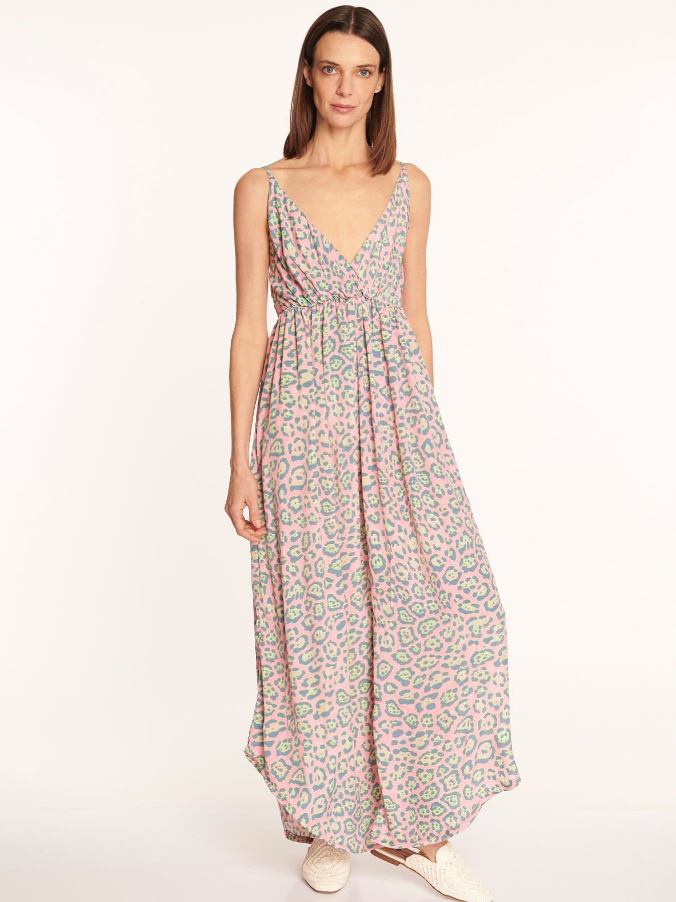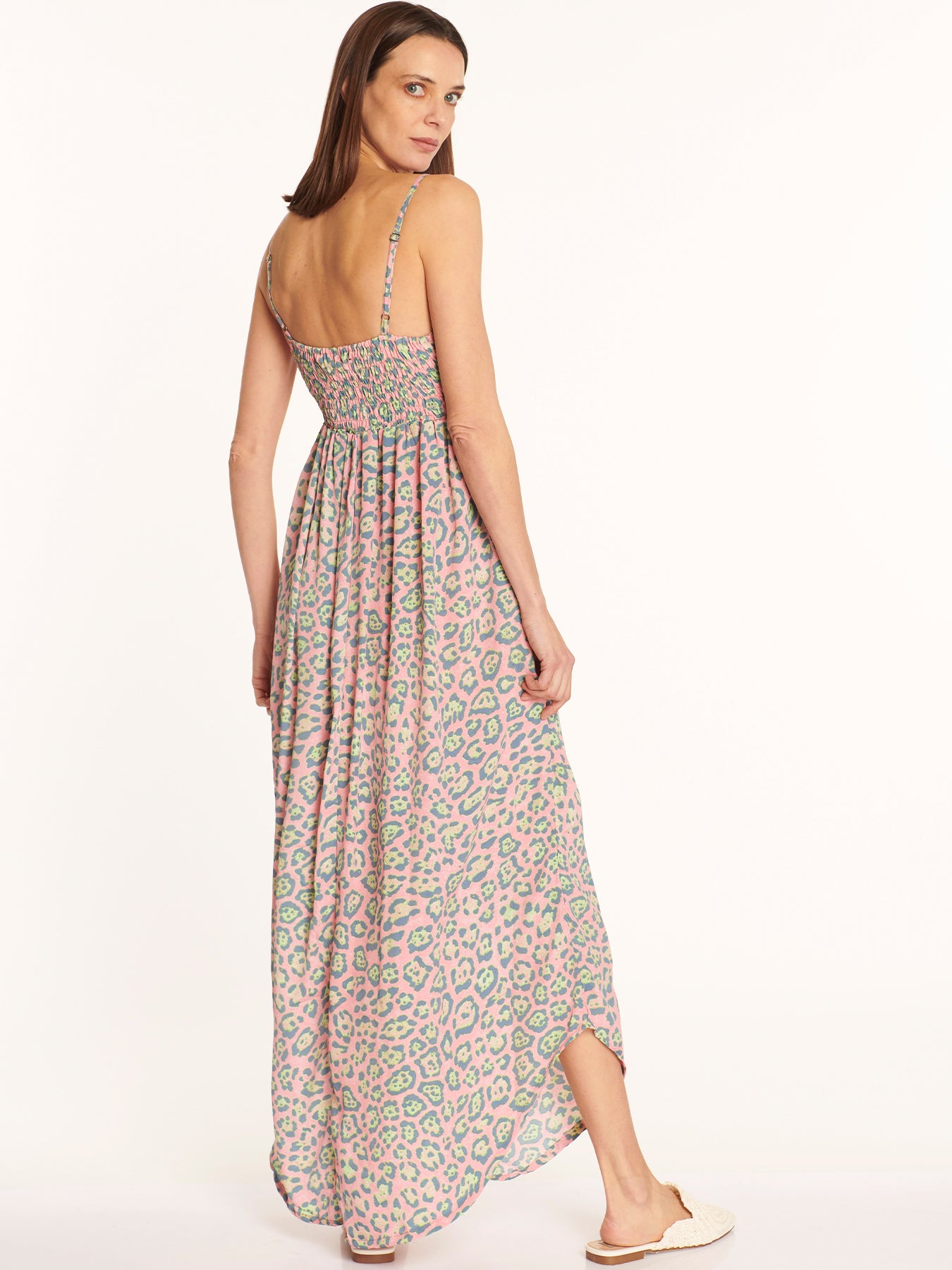 Vestido largo sin mangas con espalda descubierta y elasticos en su parte superior, tiras ajustables y un delicado diseño print