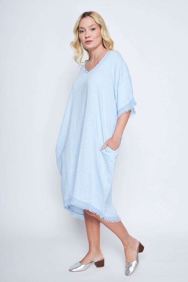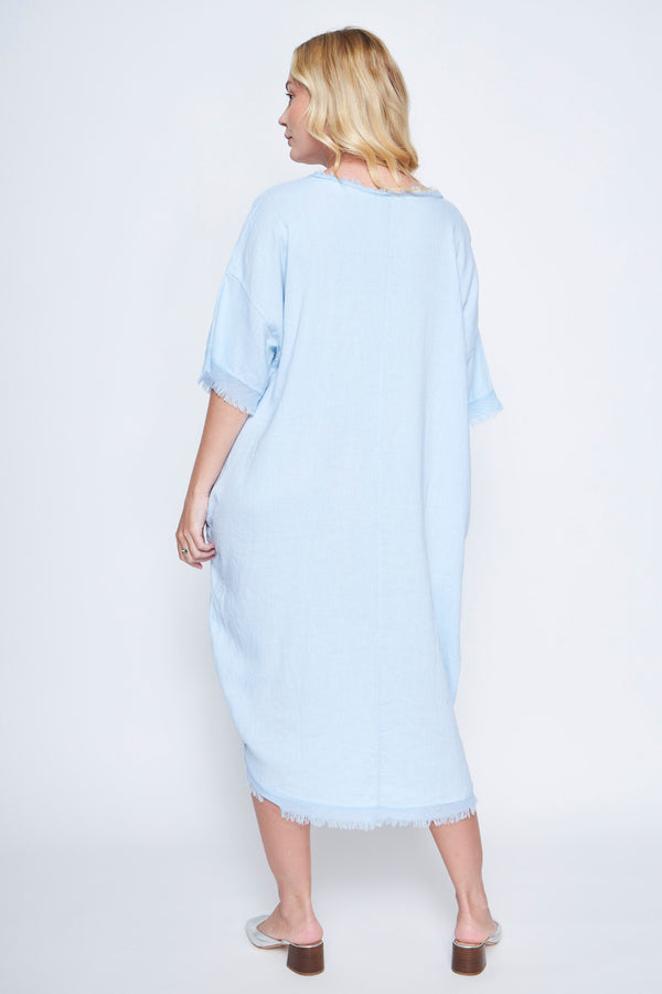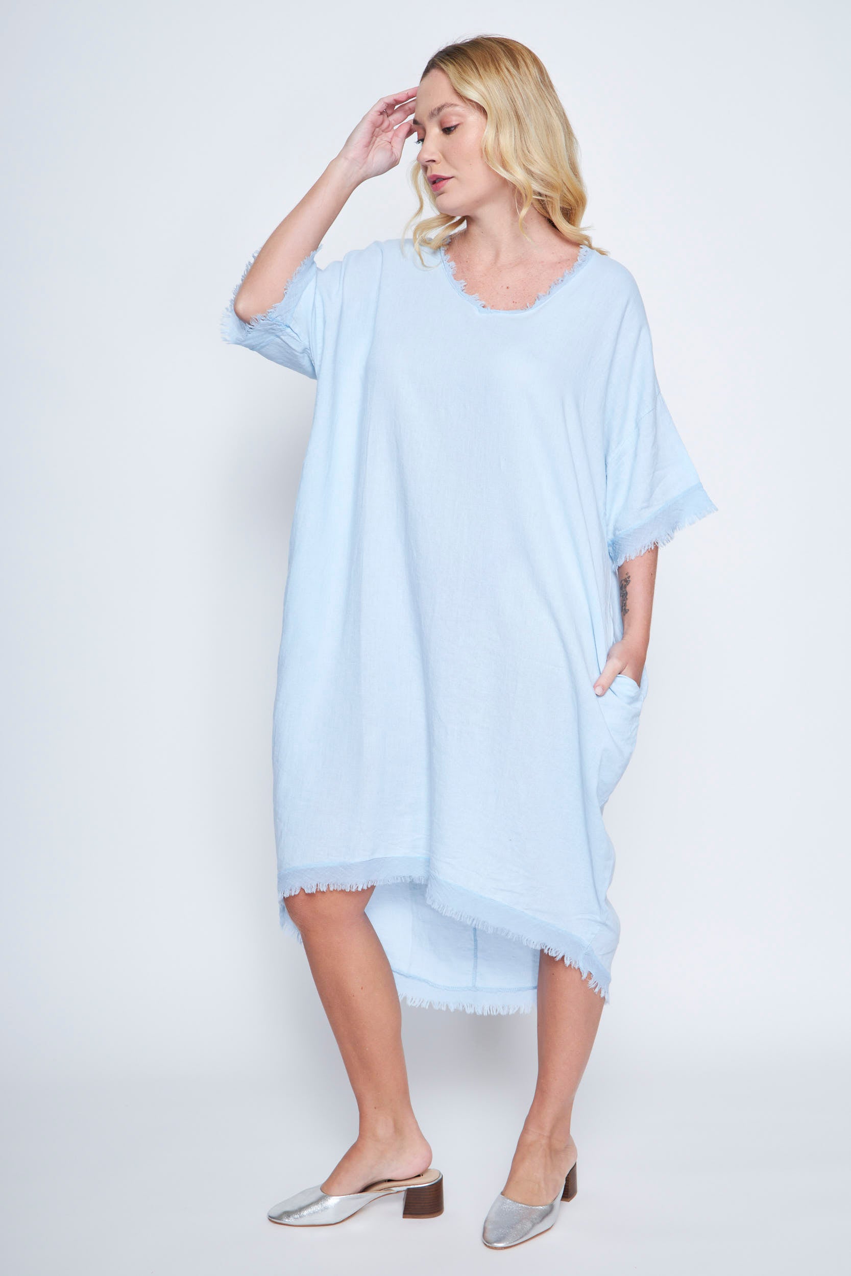 - Descripción: Este vestido de lino fluido es la elección perfecta para los días cálidos. Su diseño ligero y aireado te mantendrá fresca y cómoda, mientras que los bolsillos a los costados añaden un toque práctico y moderno.