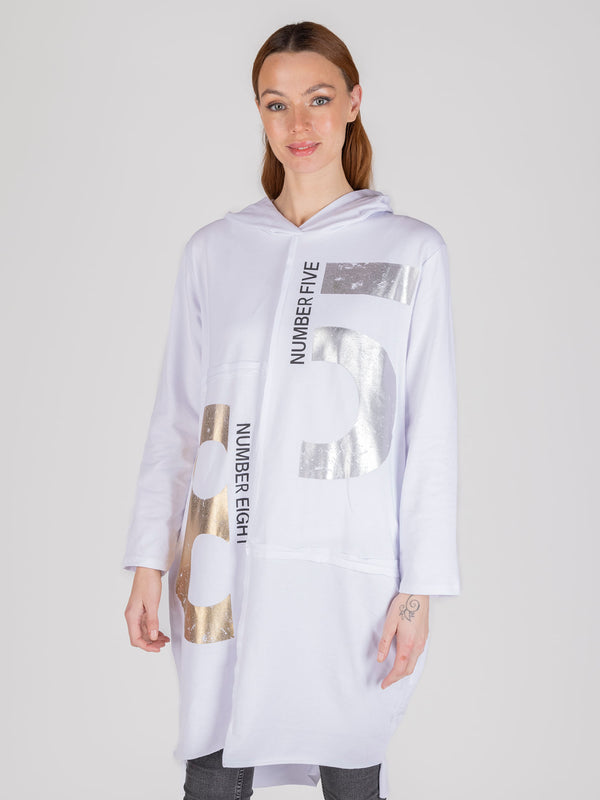 Vestido estilo deportivo, con bolsillos, capucha y cinta para ajustar. Con detalles de numeros en plateado y dorado. Ideal para looks casuales.