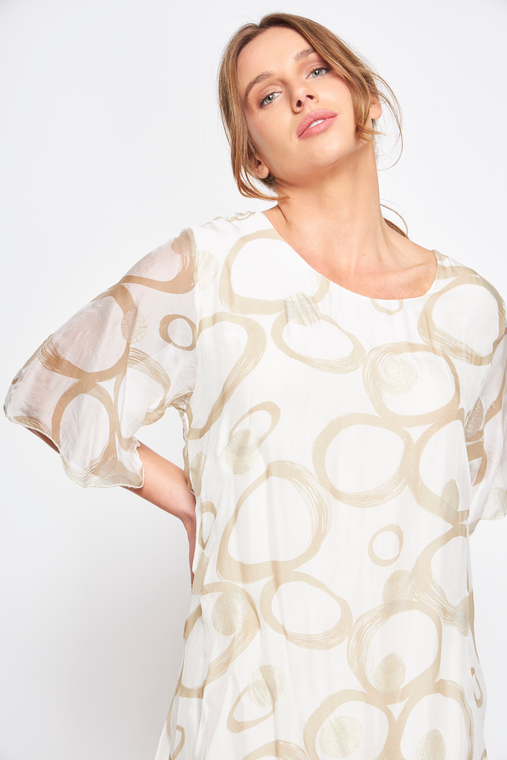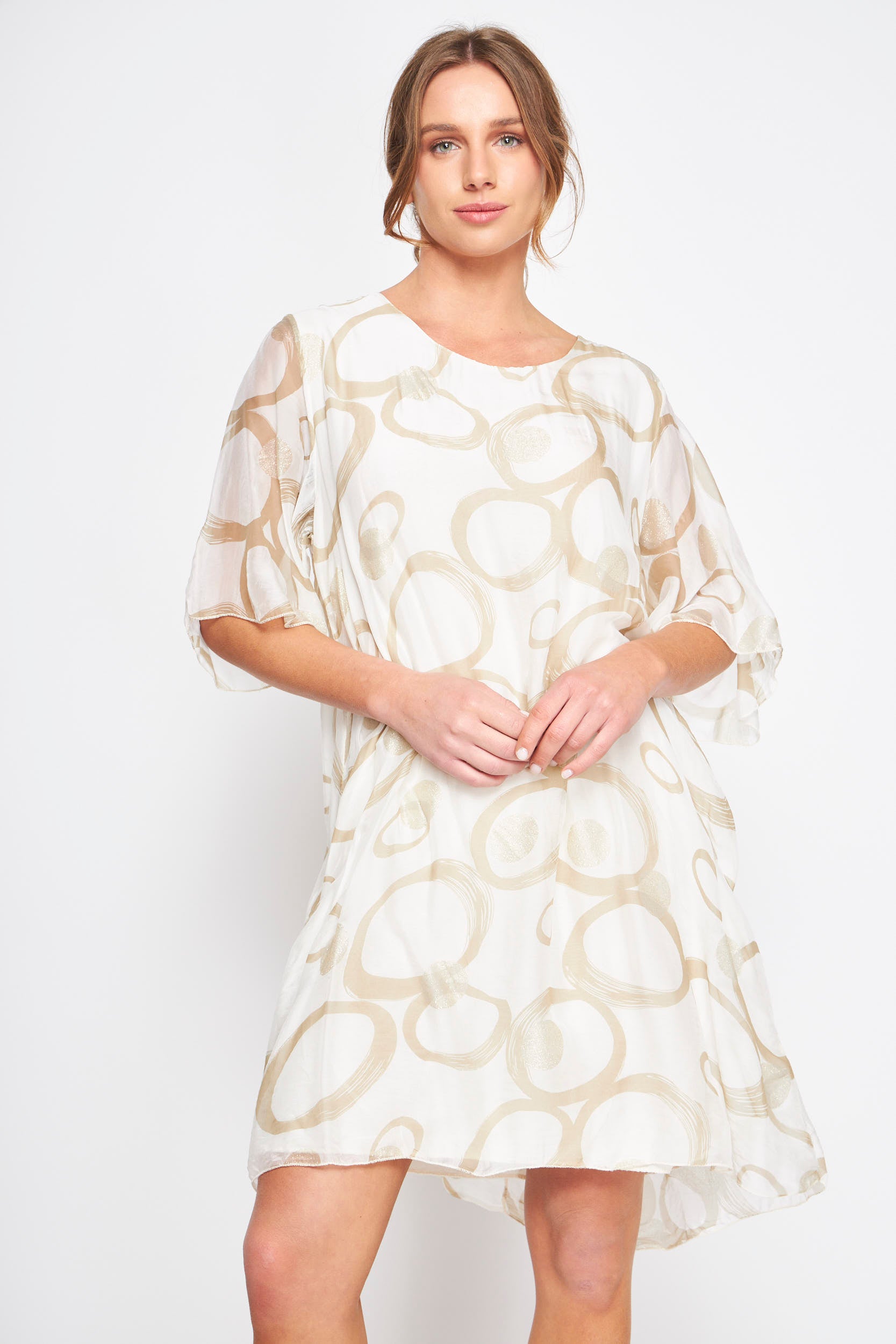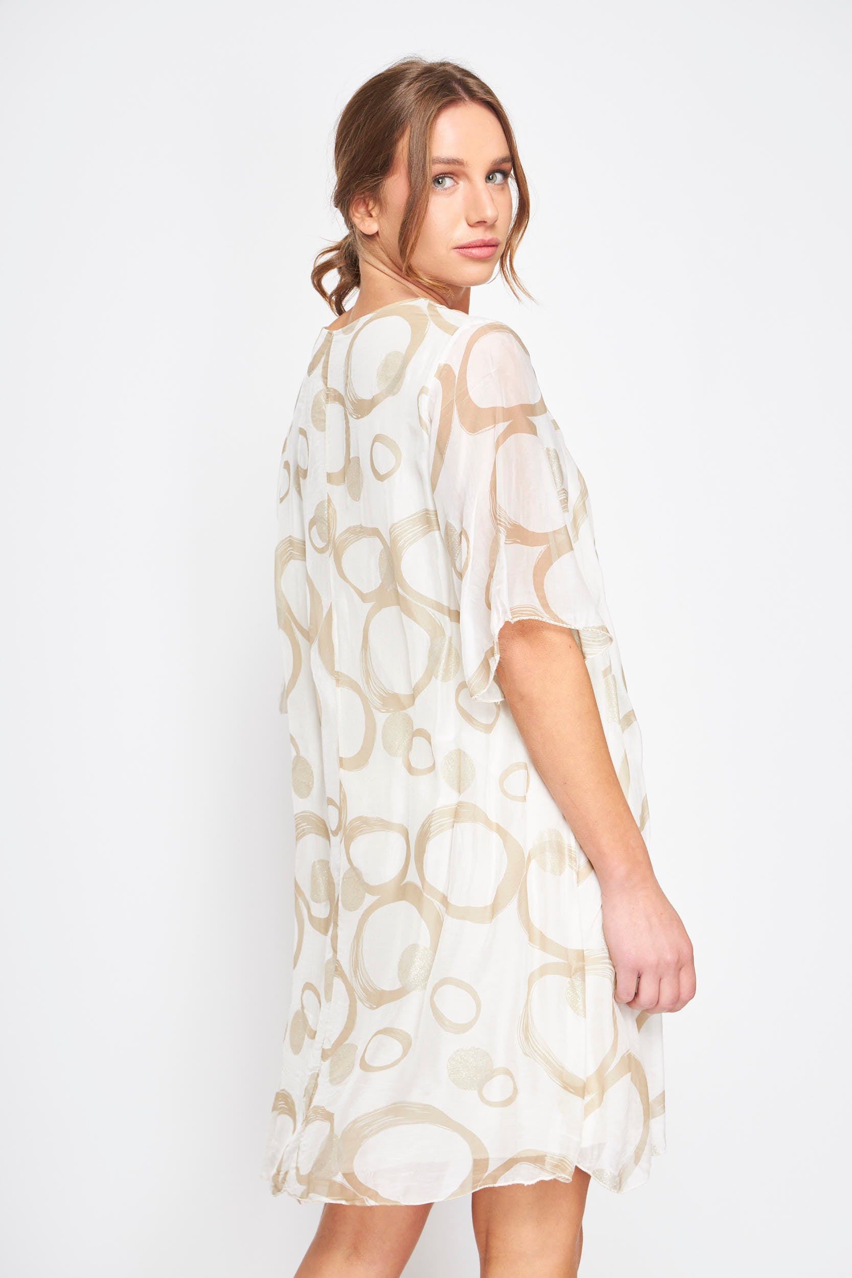 - Descripción: Este elegante vestido de manga corta presenta un diseño de sublimación con círculos y detalles dorados, perfecto para cualquier ocasión especial. Su cuello redondo añade un toque clásico y sofisticado.