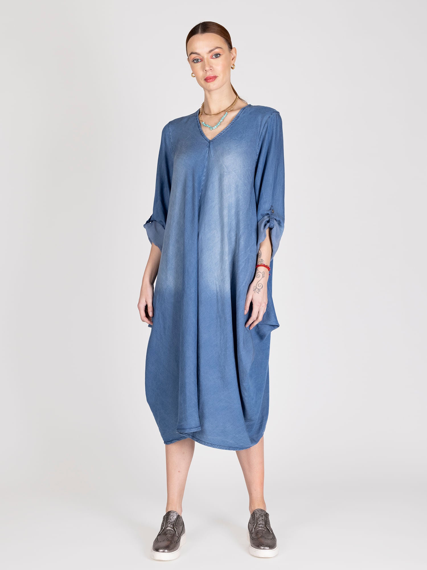 Vestido midi efecto denim, calce oversize cuello en V y con botones en mangas para ajustar. Ideal para looks casuales