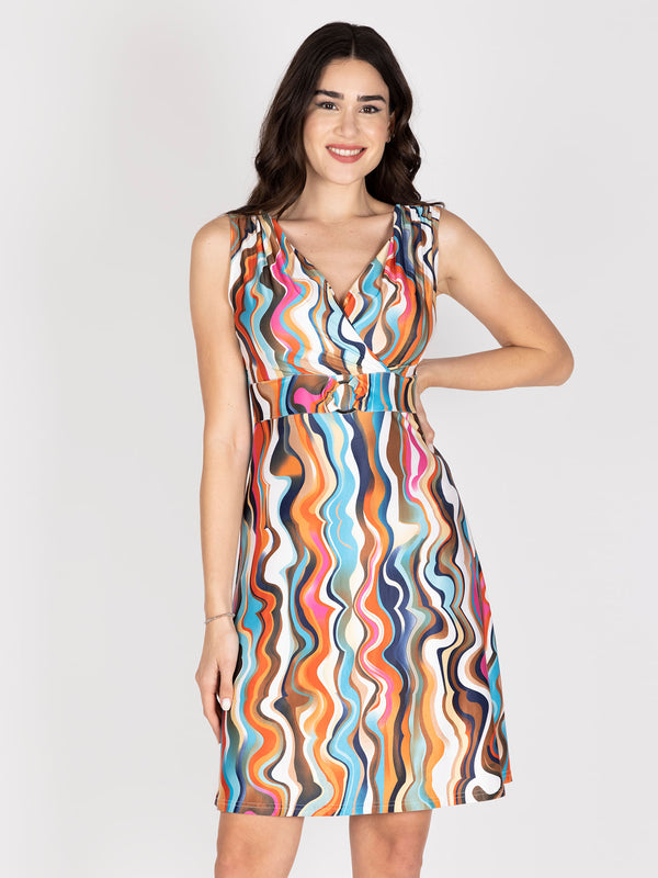 Vestido mini, escote en V, con detalle de hebilla abajo del pecho, print estilo 70s