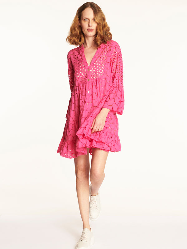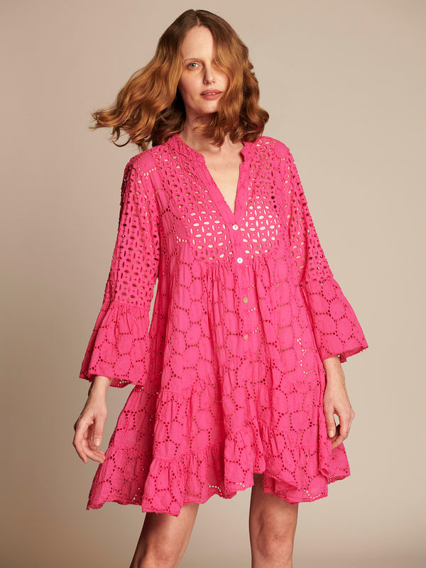 Vestido mangas 3/4 con vuelo, un delicado diseño de broderie y sistema de abotonado hasta la cadera, un cuello moa con terminacion en V