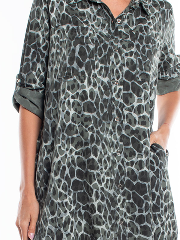 vestido holgado cuello v.abotonado parte delantera. bolsillos parte del pecho y costados a nivel de cadera manga larga ajustable. ideal para look casual.