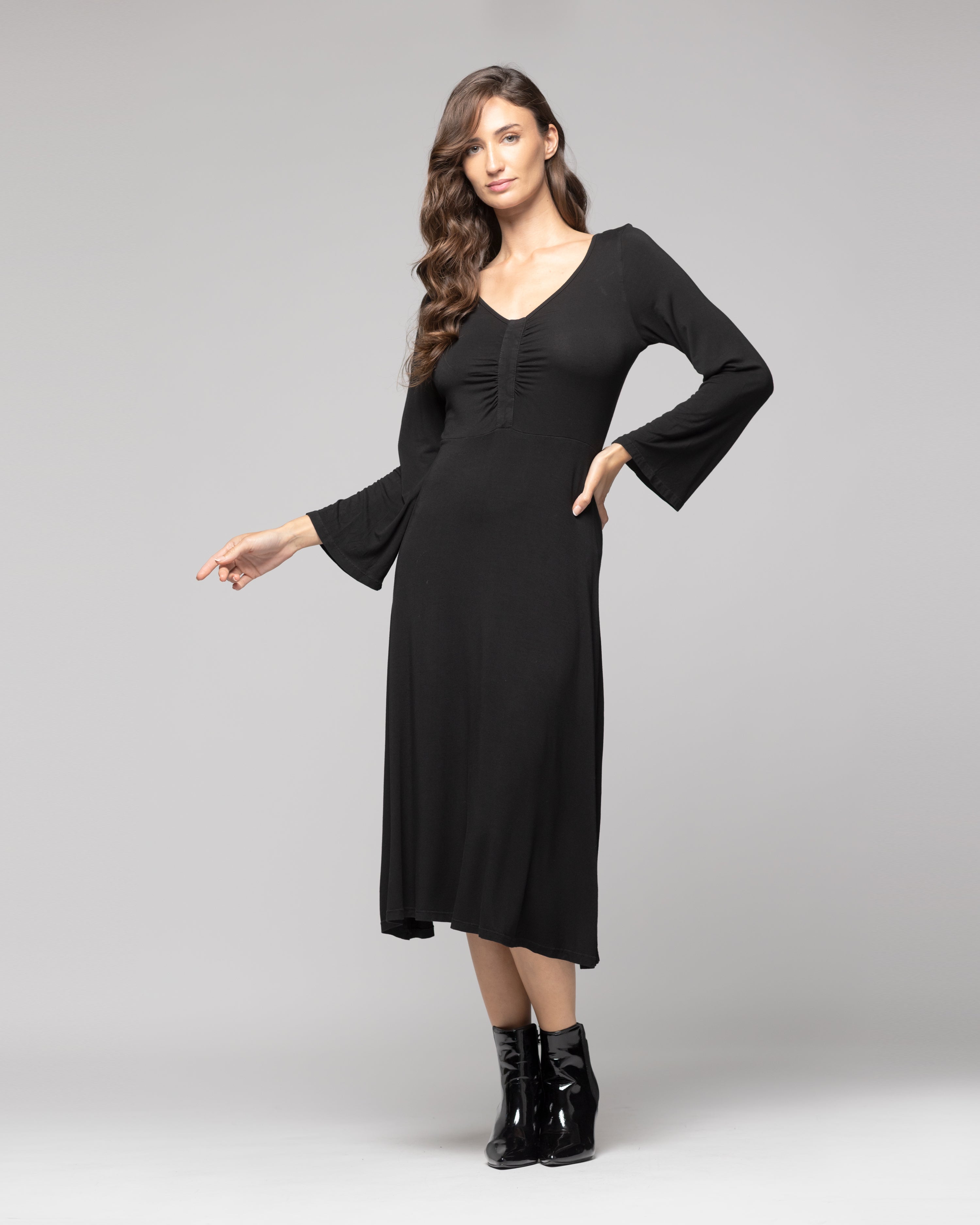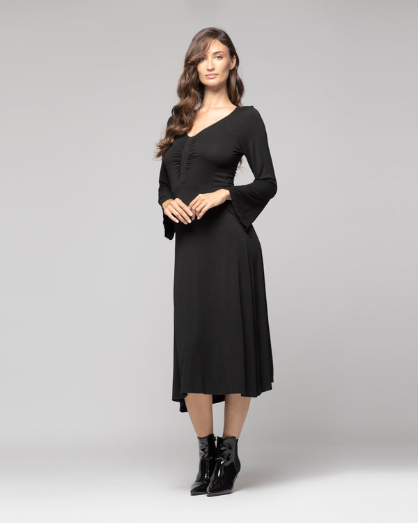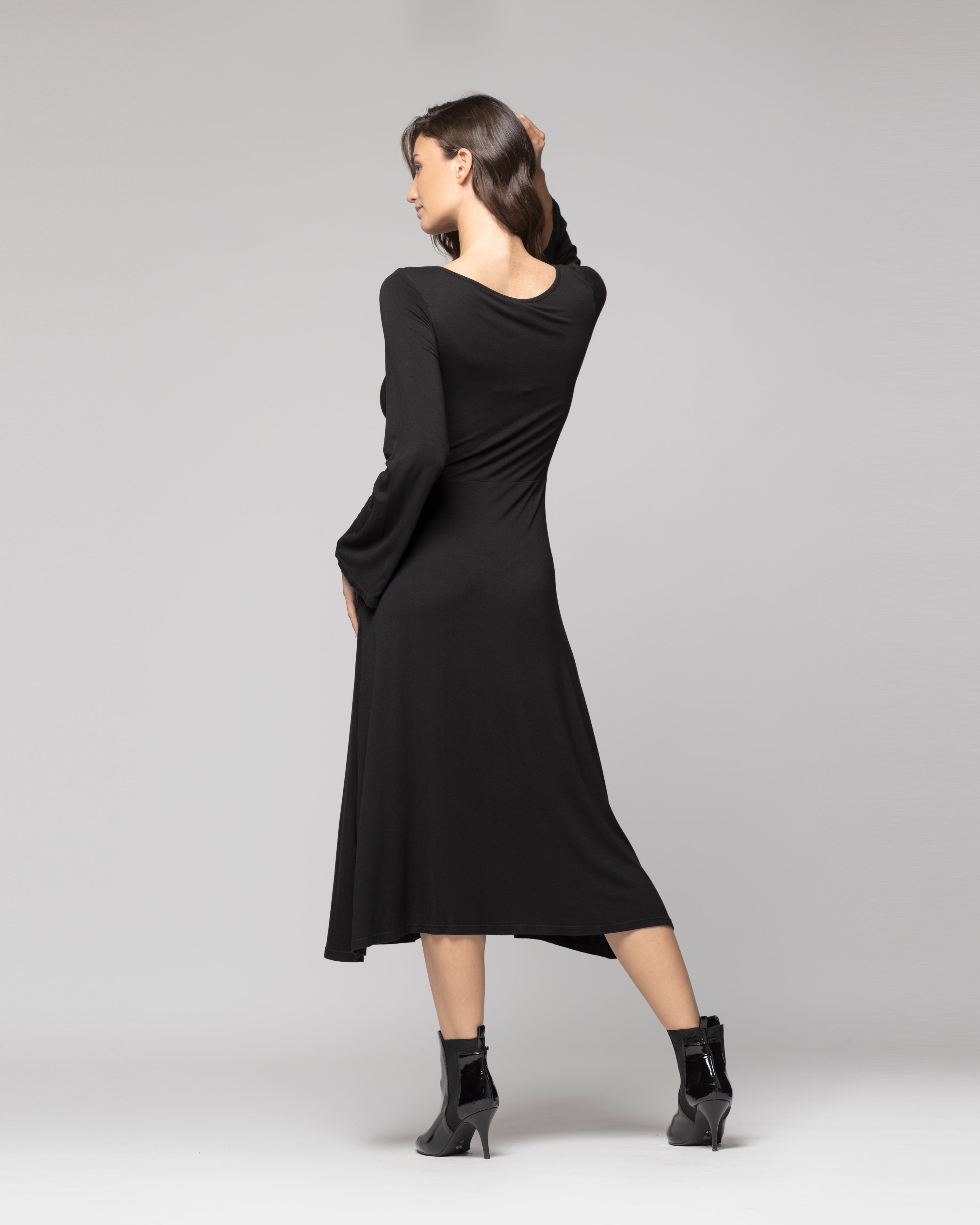 Vestido a la rodilla manga larga. Tela lisa negra. Puño suelto y ancho, escote en v y corte a la cintura. Hecha para quienes saben llevar lo suyo con actitud.