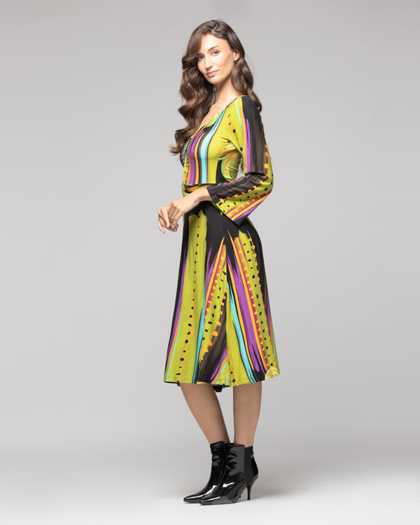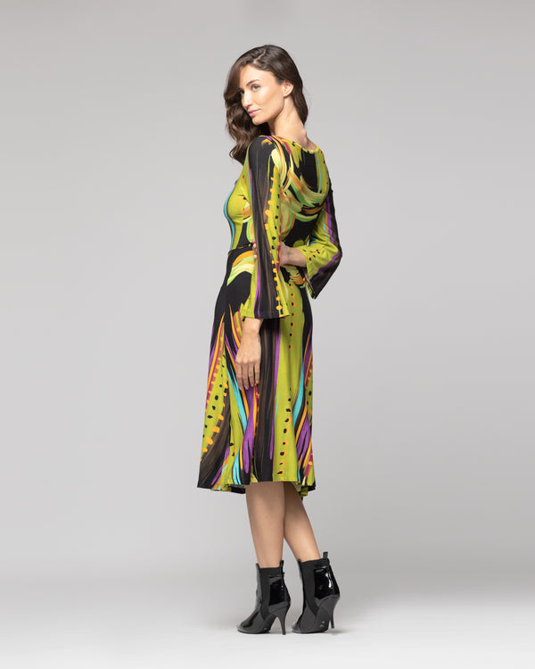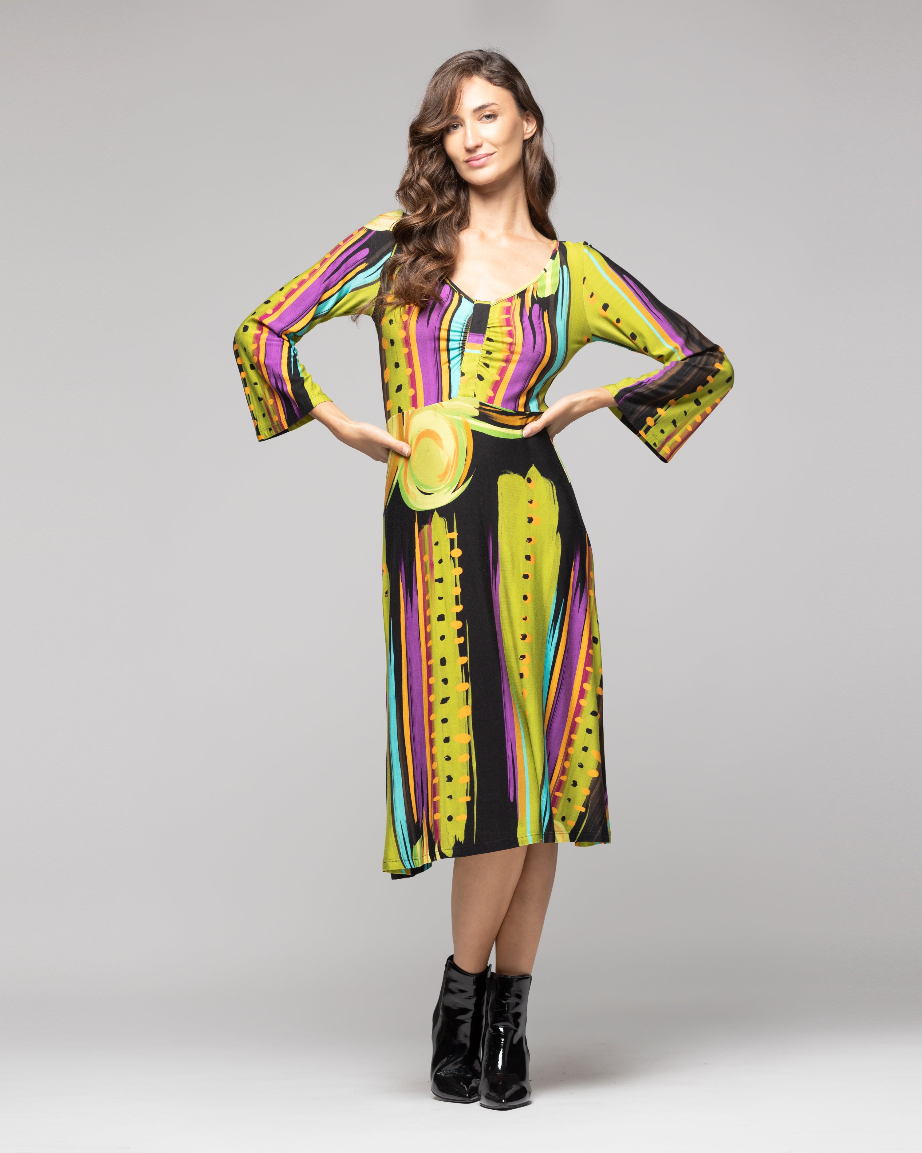 Vestido a la rodilla manga larga. Tela estampada en tonos verde y naranjo. Puño suelto y ancho, escote en v y corte a la cintura. Hecha para quienes saben llevar lo suyo con actitud.