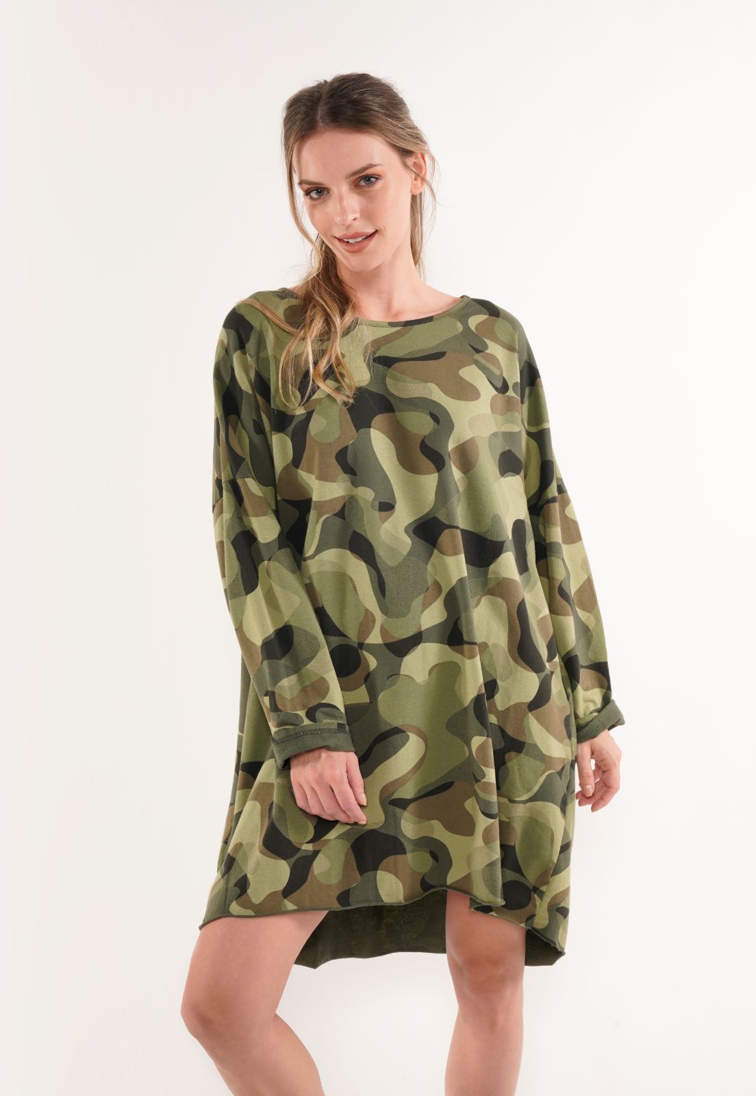 Vestido cuello en u, manga larga y estampado estilo militar y corte en diagonal en la parte inferior. Ideal para combinar con sneakers